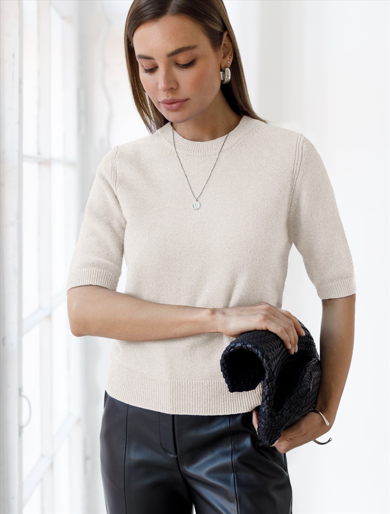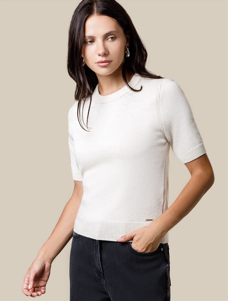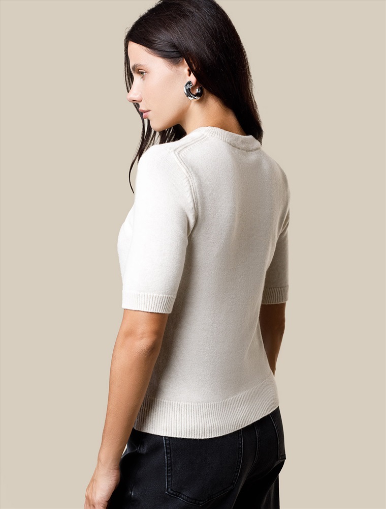 Размер товара на первом фото: 42 Джемпер с коротким рукавом выполнен из мягкой пряжи с кашемиром. Лаконичная модель с круглым воротом идеально сидит по фигуре. Благодаря своей универсальности подойдет для любого гардероба и в офисный дресс-код. Мягкая пряжа очень приятная к телу, поддержит комфорт на протяжении всего дня, при этом не перегревая. Сочетается в костюме с брюками D38.013, D38.012 и юбкой D36.016