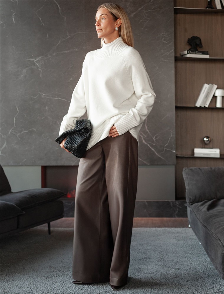 Джемпер с воротом стойка выполнен из мягкой пряжи с кашемиром. Модель свободного силуэта с рукавом реглан будет стильно сочетается с брюками и джинсами. Мягкая пряжа очень приятная к телу, поддержит комфорт на протяжении всего дня, при этом не перегревая. Сочетается в костюме с брюками D38.013, D38.012 и юбкой D36.016
