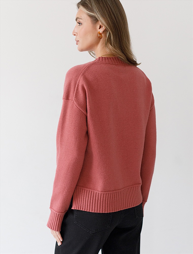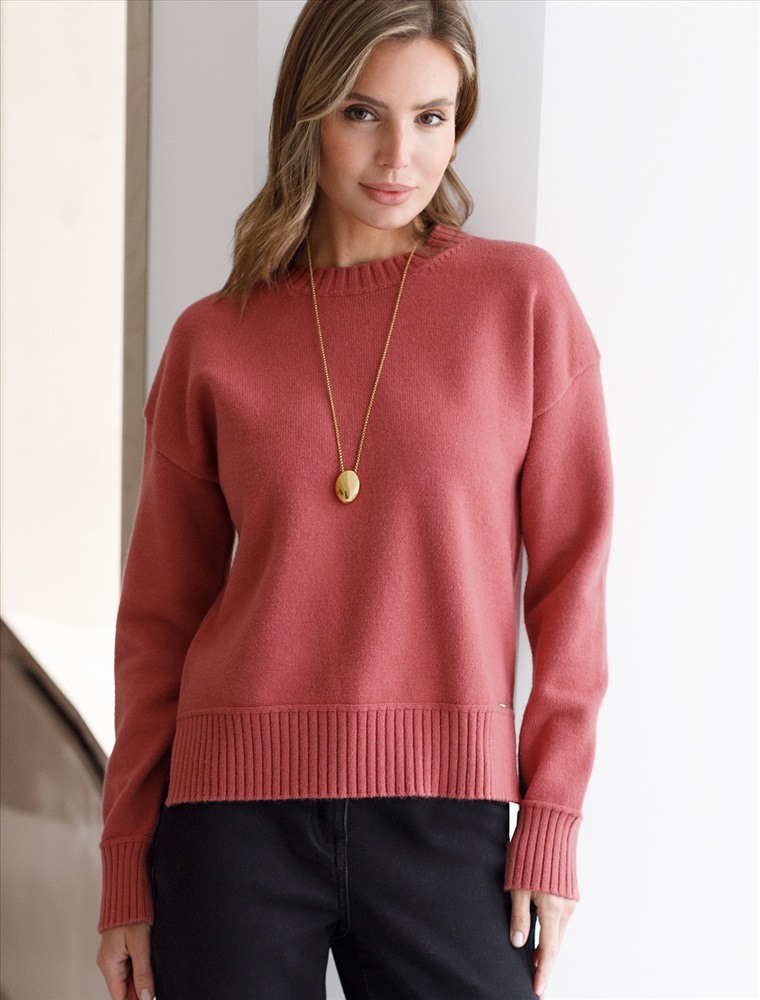 Размер товара на первом фото: 42 Укороченный джемпер темно-кораллового цвета с круглым вырезом связан из высококачественной пряжи с кашемиром — идеальное сочетание мягкости и практичности. Пряжа с кашемиром придаёт ему бархатистую нежность и тонкую структуру, каждое прикосновение с которой, напоминает о тепле и уюте в прохладные дни. Благодаря нежной текстуре материала этот вариант отлично подходит даже для чувствительной кожи, не вызывая раздражения и дискомфорта в течение дня. Сдержанный, элегантный силуэт джемпера подчёркивает вкуc обладательницы, а филигранная отделка ворота — внимание к деталям. Универсальный оттенок и изящная мягкость делают его идеальным выбором в любой ситуации Широкие манжеты и нижний край добавляют аккуратности, а продуманная посадка и небольшие разрезы по бокам делают повседневный джемпер удобным для многослойных образов — от офисного комплекта до расслабленного уикенда. Свободный крой джемпера идеально подходит для женщин, которые ценят удобство и стиль одновременно, а так же идеальноподходит на большие размеры. Благодаря качественной пряже свитер сохраняет форму и внешний вид даже после многократных носок. Практичный фасон идеально подходит для работы в офисе или встреч с друзьями. Благодаря классическому крою джемпер гармонично сочетается практически с любыми элементами гардероба, помогая всегда выглядеть актуально. Сочетается в костюме с брюками D38.013, D38.012 и юбкой D36.016 Комментарии к товару