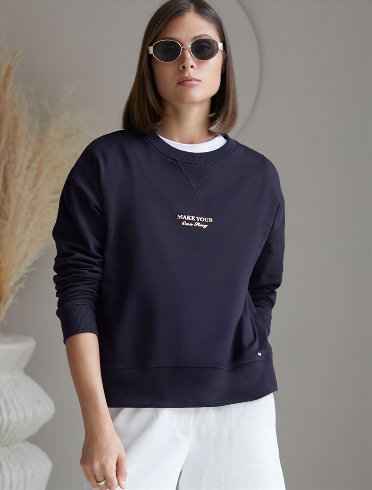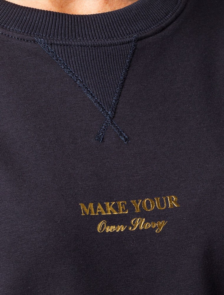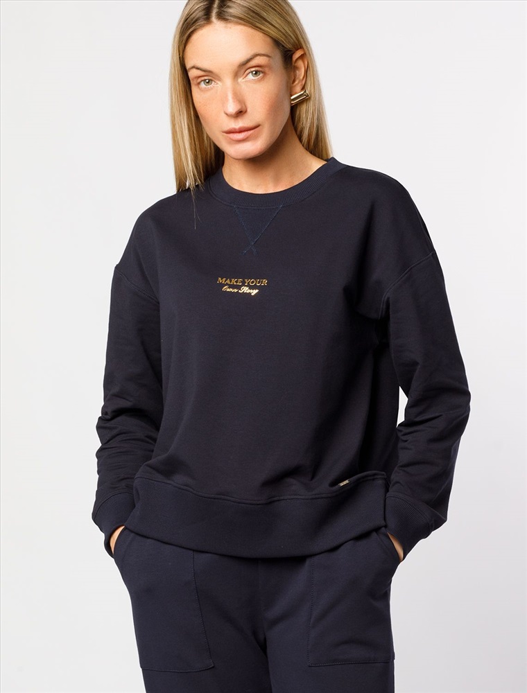 Плотность: 240 Г/м2 Параметры модели на первом фото: Рост 172, бюст 88, талия 64, бедра 88 Перевод принта: Make your own story - стань автором своей истории. Джемпер среднего объема со спущенным плечом выполнен из футера двухнитки с эластаном. Принт нанесен фактурной золотой краской. Эластичный материал гарантирует комфорт и формоустойчивость. Сочетается в костюме с брюками D44.138, D44.139 и шортами D48.008. Изделие дополнено металлическим логотипом бренда. Комментарии к товару