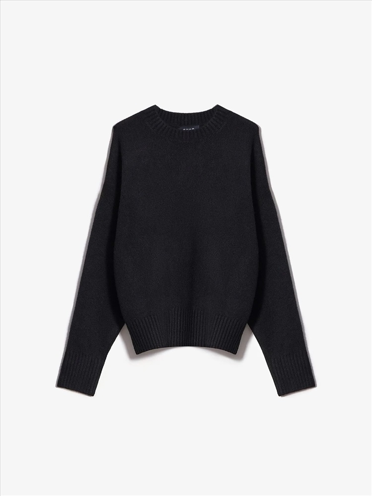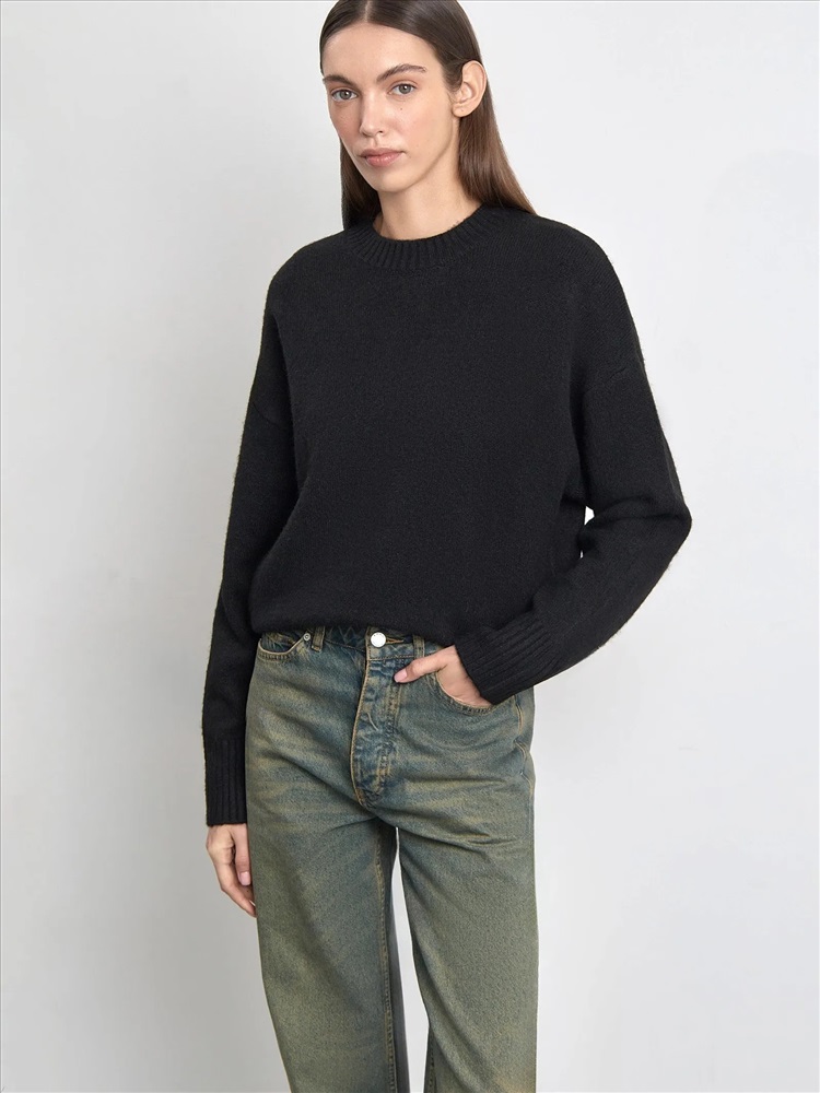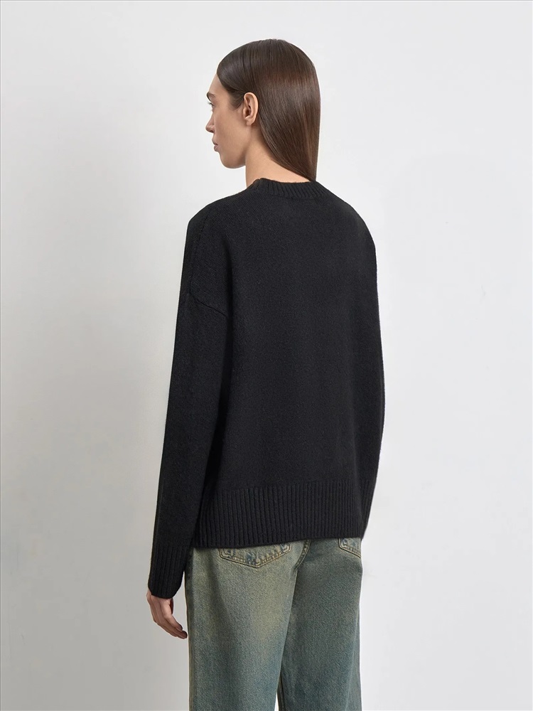 Мягкий базовый джемпер на каждый день. Выполнен в чёрном цвете из практичного материала с содержанием шерсти. Свободная модель прямого кроя со спущенным плечом создаёт расслабленный образ. Сочетается с любым базовым низом.