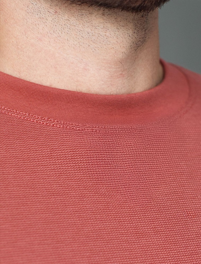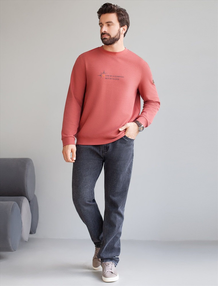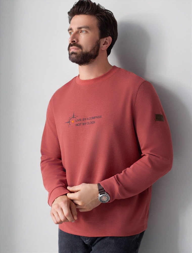 Легкий и невероятно комфортный джемпер кирпичного цвета создан для повседневного образа. Мягкий фактурный эластичный трикотаж приятно ощущается на теле, не сковывает движения и отлично подходит для носки в любое время года. Полуприлегающий крой обеспечивает свободу и удобство, позволяя выглядеть стильно и чувствовать себя уверенно каждый день. Круглый ворот украшен декоративной нашивкой в виде перевернутого треугольника, добавляющей оригинальности.. Манжеты на рукавах и по низу аккуратно оформлены, что придает завершенность внешнему виду и способствует сохранению формы джемпера после длительной носки и многочисленных стирок. Принт в виде небольшой надписи добавляет яркости, подчеркивая индивидуальность каждого мужчины. Перевод надписи: Live by а compass not by clock - Жить по компасу, а не по часам.
