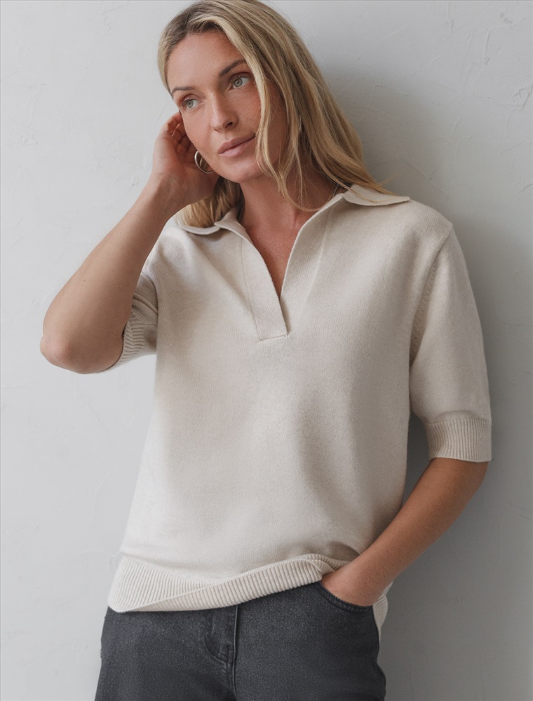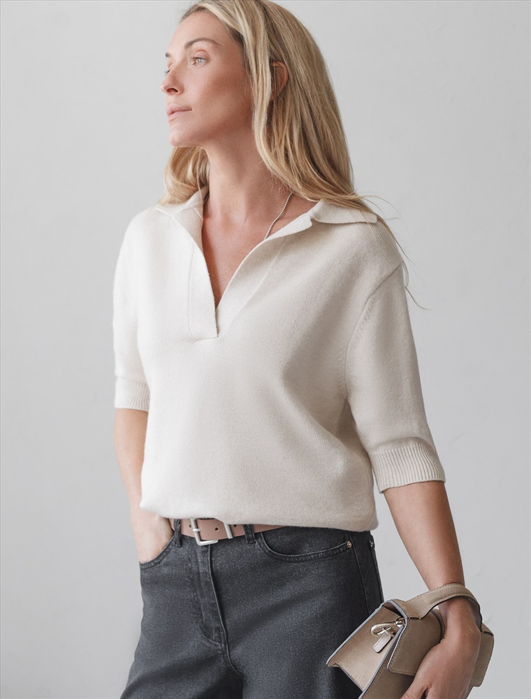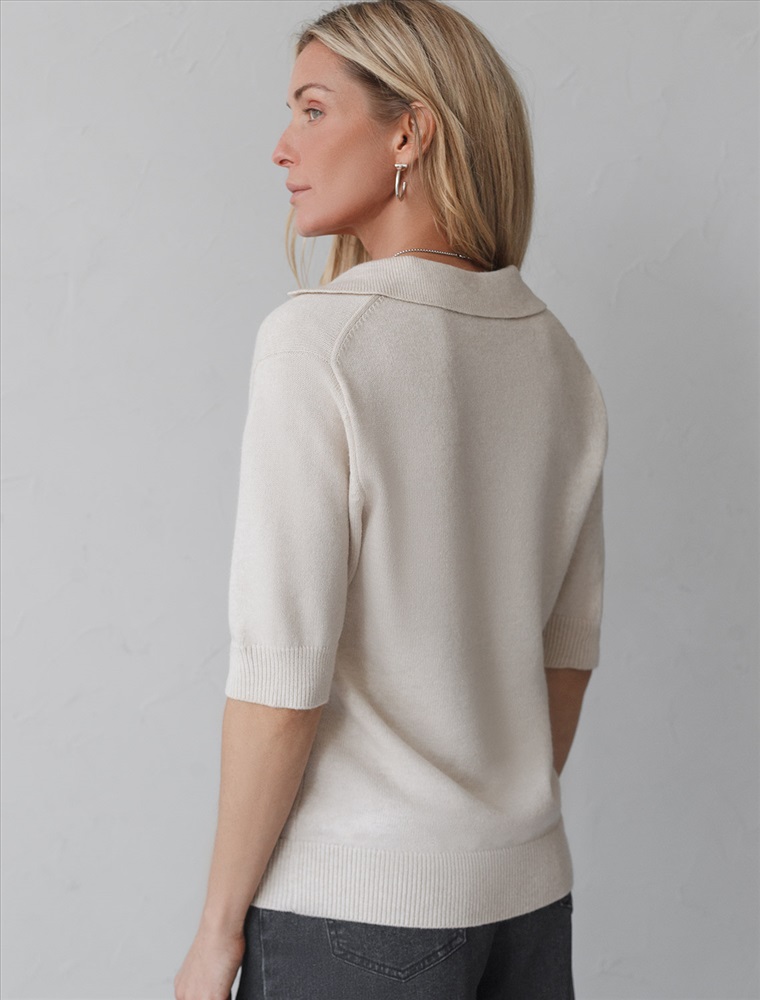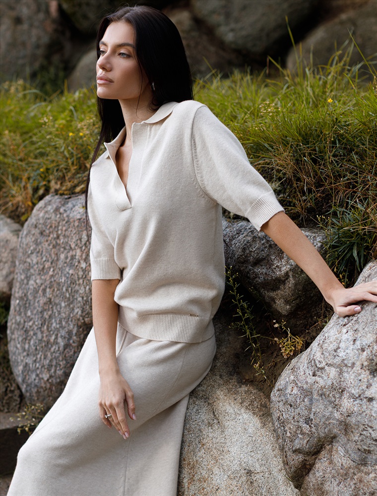 Размер товара на первом фото: 42 Джемпер с воротом планкой как у поло выполнен из мягкой пряжи с кашемиром. Модель с коротким рукавом свободного силуэта. Благодаря своей универсальности подойдет для любого гардероба и в офисный дресс-код. Мягкая пряжа очень приятная к телу, поддержит комфорт на протяжении всего дня, при этом не перегревая. Сочетается в костюме с брюками D38.013, D38.012 и юбкой D36.016