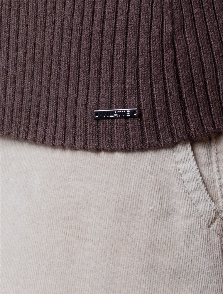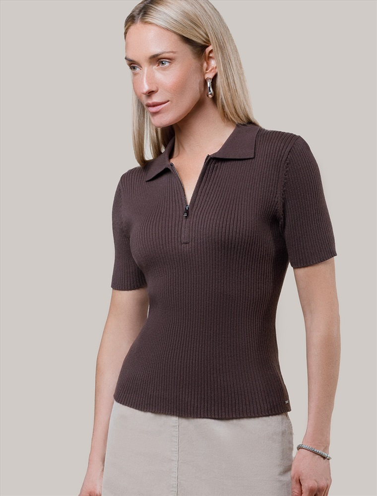 Размер товара на первом фото: 42 Джемпер-поло тонкой вязки выполнен из хлопка с добавлением кашемира. Модель с воротом как у поло дополнена застежкой на молнию и металлическим логотипом бренда. Мягкая и очень приятная пряжа в рубчик совершенно не колется, сохраняет тепло при этом не перегревая, гарантируя безупречный комфорт.