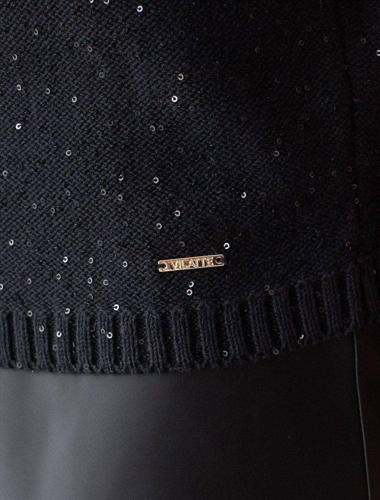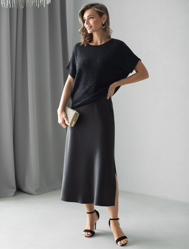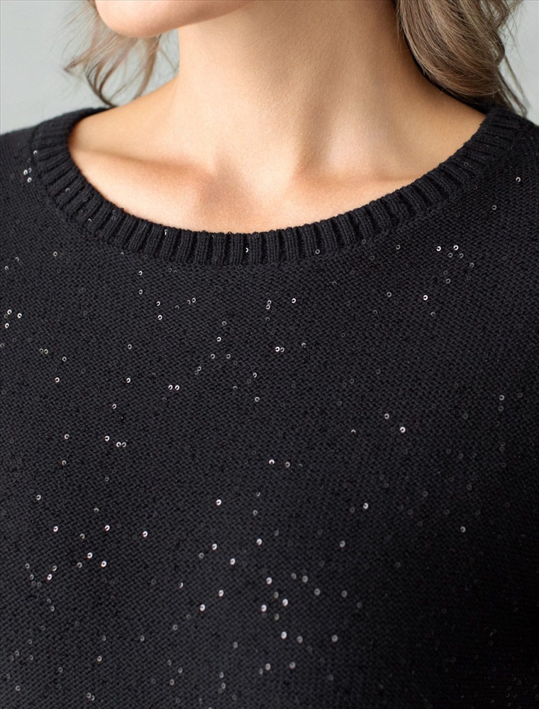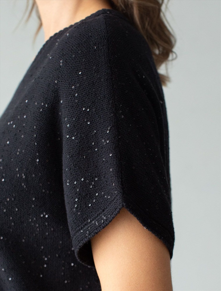 Легкий джемпер черного цвета с цельнокроенным коротким рукавом выполнен из хлопковой пряжи с вкраплением сияющих пайеток, что придает особую изысканность. Стильный джемпер связан изнанкой, пряжа отличается легкостью и приятной текстурой, совершенно не колется, обеспечивает комфорт даже при длительном использовании, а натуральные волокна поддерживают оптимальный температурный баланс. Свободный крой и цельнокроенный рукав создают расслабленный, но аккуратный образ. Нарядный джемпер подойдет девушкам и женщинам больших размеров, в нем вы будете чувствовать себя уверенно и свободно в любой ситуации. Мерцающий эффект пайеток добавляет образу выразительности и индивидуальности. Мерцающее полотно добавляет особого шарма вашему образу, делая его уместным как на праздник, так и для повседневного выхода. Новый год, вечеринка или любое другое мероприятие пройдут ярко — сияющие пайетки создают ощущение праздника в каждом движении. Для спокойного повседневного аутфита добавьте к этому эффектному джемперу спокойный низ, близкий по цвету, без дополнительных элементов декора.