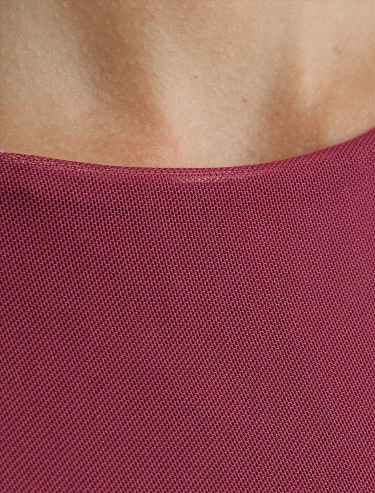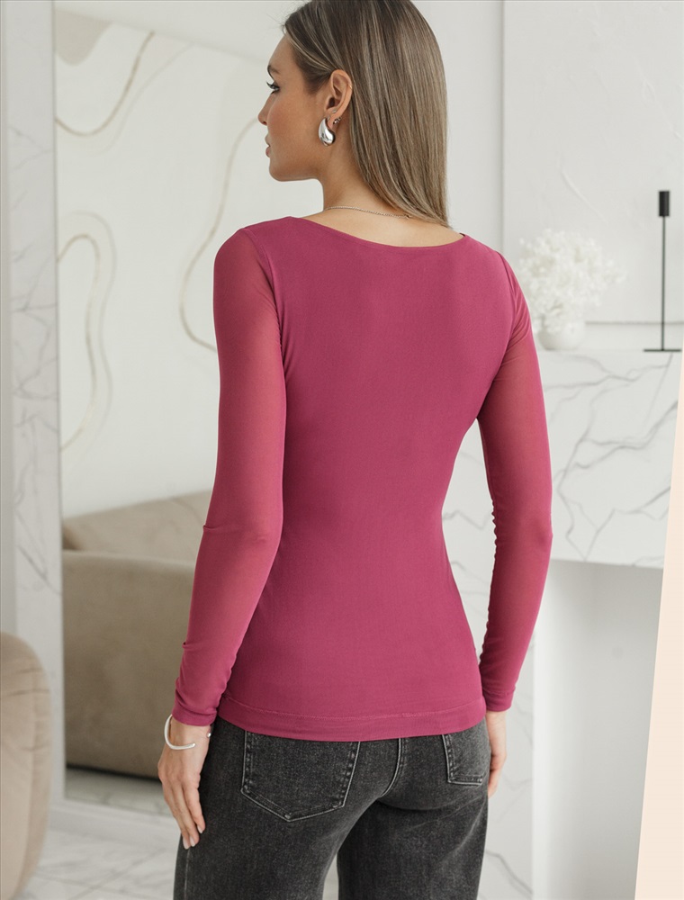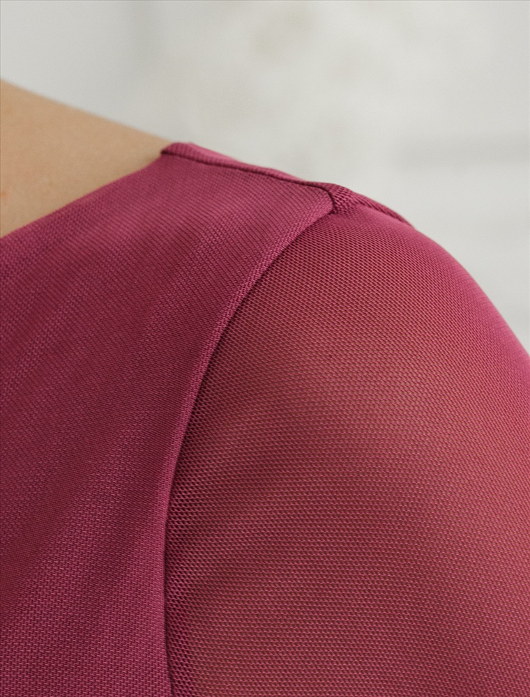 Джемпер с вырезом лодочкой и прозрачными рукавами создает женственный и элегантный образ. Тело джемпера лилового цвета выполнено из плотного вискозного трикотажа, обеспечивающего комфорт, в то время как рукава из тонкой сетки создают стильный контраст. Глубокий вырез лодочка подчеркивает линию плеч и создает элегантный силуэт. Идеальный выбор для стильных образов!
