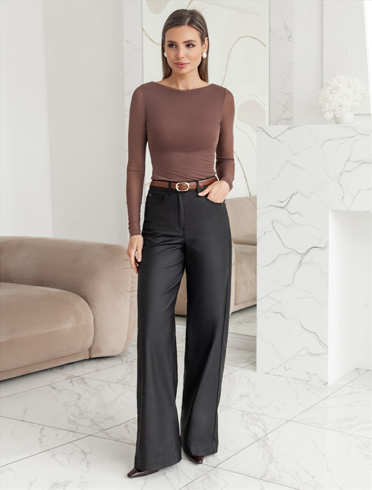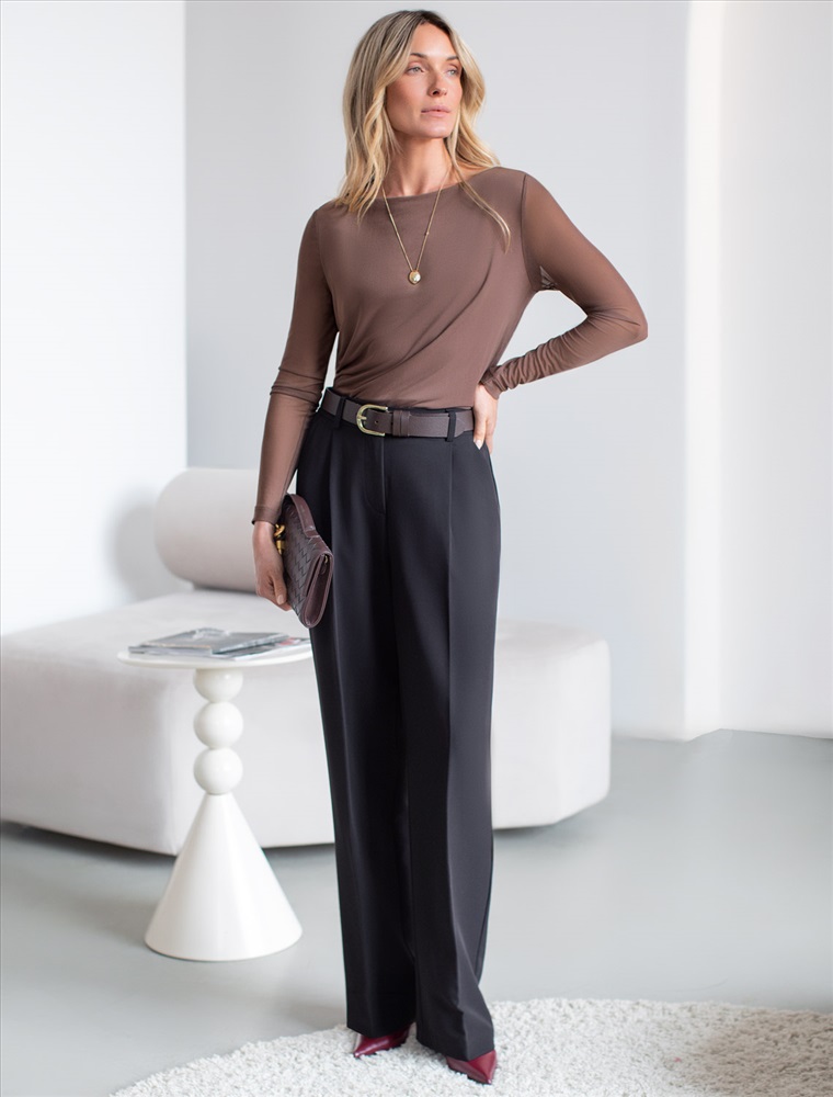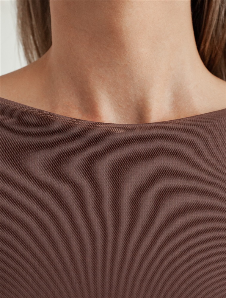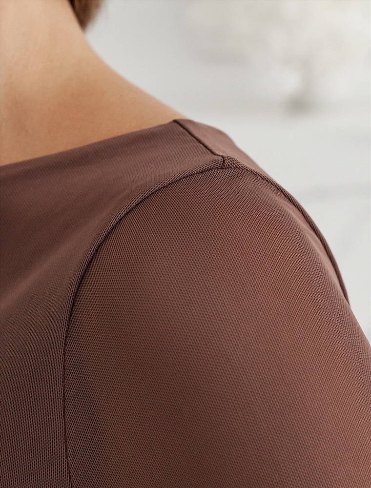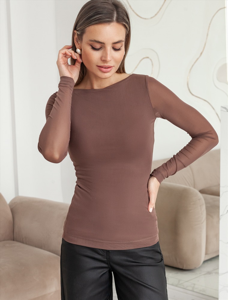 Джемпер с вырезом лодочкой и прозрачными рукавами создает женственный и элегантный образ. Тело джемпера кофейного цвета выполнено из плотного вискозного трикотажа, обеспечивающего комфорт, в то время как рукава из тонкой сетки создают стильный контраст. Глубокий вырез лодочка подчеркивает линию плеч и создает элегантный силуэт. Идеальный выбор для стильных образов!