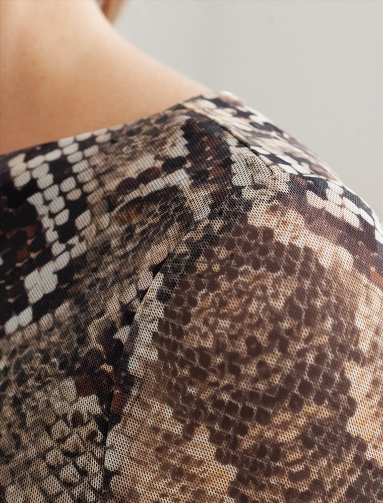 Состав: 95%ПЭ 5%ПУ; ПОДКЛАДКА- 95%Вис 5%ПУ Дерзкий тренд этого сезона! Модель сочетает роскошный змеиный принт с соблазнительными полупрозрачными рукавами из тонкой сетки. Глубокий вырез-лодочка подчеркивает линию плеч, создавая элегантный и одновременно смелый образ. Идеальный выбор для стильных образов!