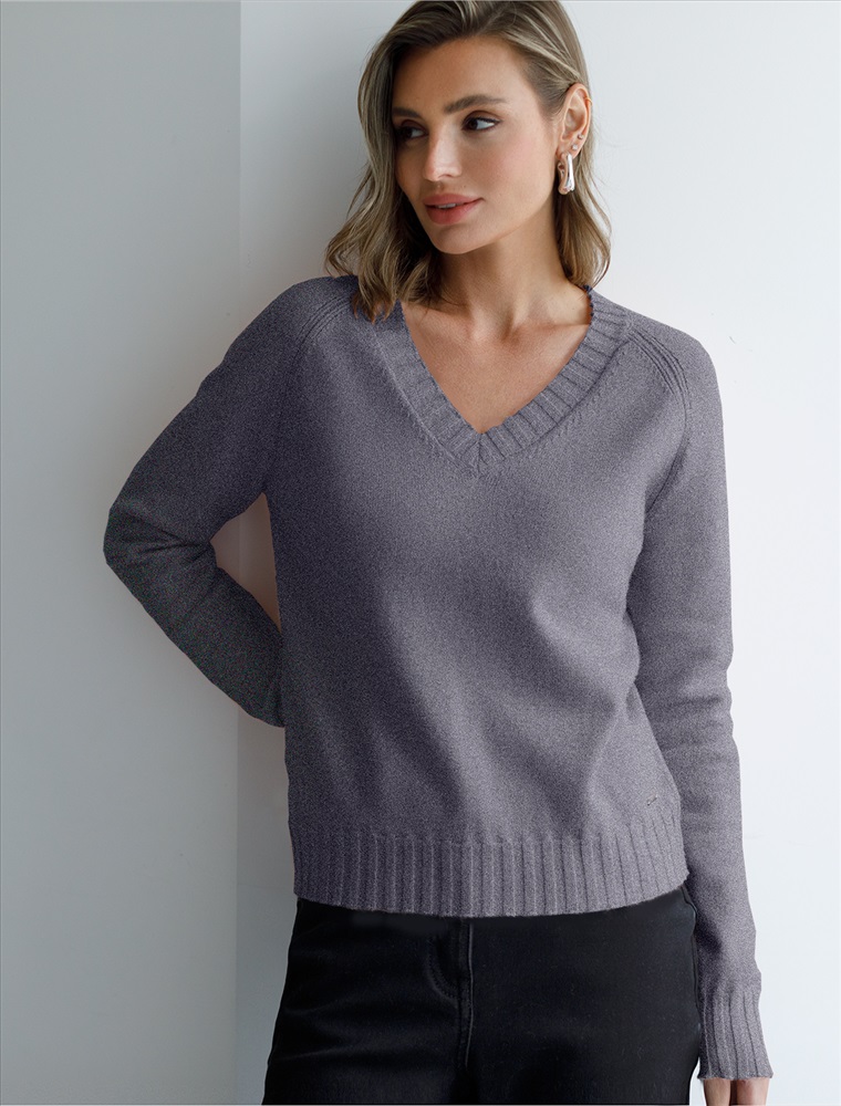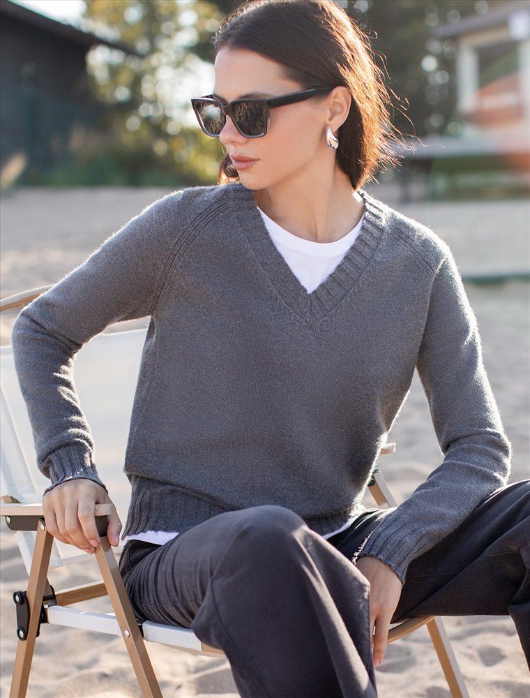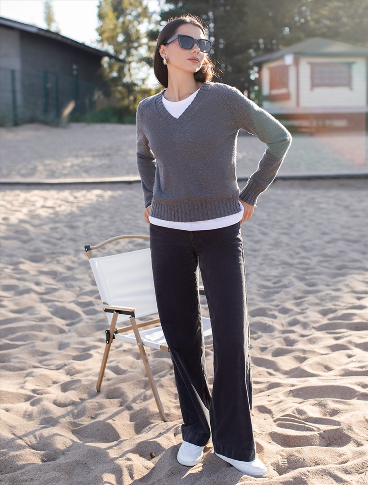 Невероятно женственный джемпер темно-серого цвета с V вырезом связан из высококачественной пряжи с кашемиром — идеальное сочетание мягкости и практичности. Пряжа с кашемиром придаёт ему бархатистую нежность и тонкую структуру, каждое прикосновение с которой, напоминает о тепле и уюте в прохладные дни. Благодаря нежной текстуре материала этот вариант отлично подходит даже для чувствительной кожи, не вызывая раздражения и дискомфорта в течение дня. Сдержанный, элегантный силуэт джемпера подчёркивает вкуc обладательницы, а филигранная отделка ворота — внимание к деталям. Универсальный оттенок и изящная мягкость делают его идеальным выбором в любой ситуации. Широкие манжеты и нижний край добавляют аккуратности, а продуманная посадка делает повседневный джемпер удобным для многослойных образов — от офисного комплекта, например, в сочетании с блузкой, до расслабленного уикенда. Свободный крой джемпера идеально подходит для женщин, которые ценят удобство и стиль одновременно, а так же идеально подходит на большие размеры. Благодаря качественной пряже свитер сохраняет форму и внешний вид даже после многократных носок. Практичный фасон идеально подходит для работы в офисе или встреч с друзьями. Благодаря классическому крою джемпер гармонично сочетается практически с любыми элементами гардероба, помогая всегда выглядеть актуально. Сочетается в костюме с брюками D38.013, D38.012 и юбкой D36.016