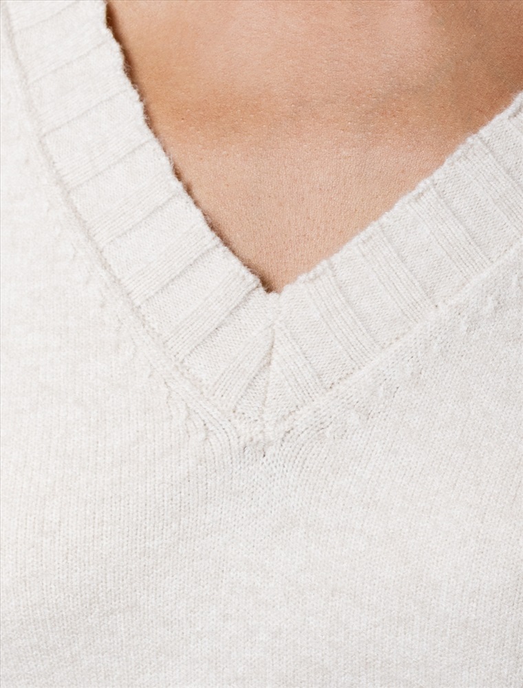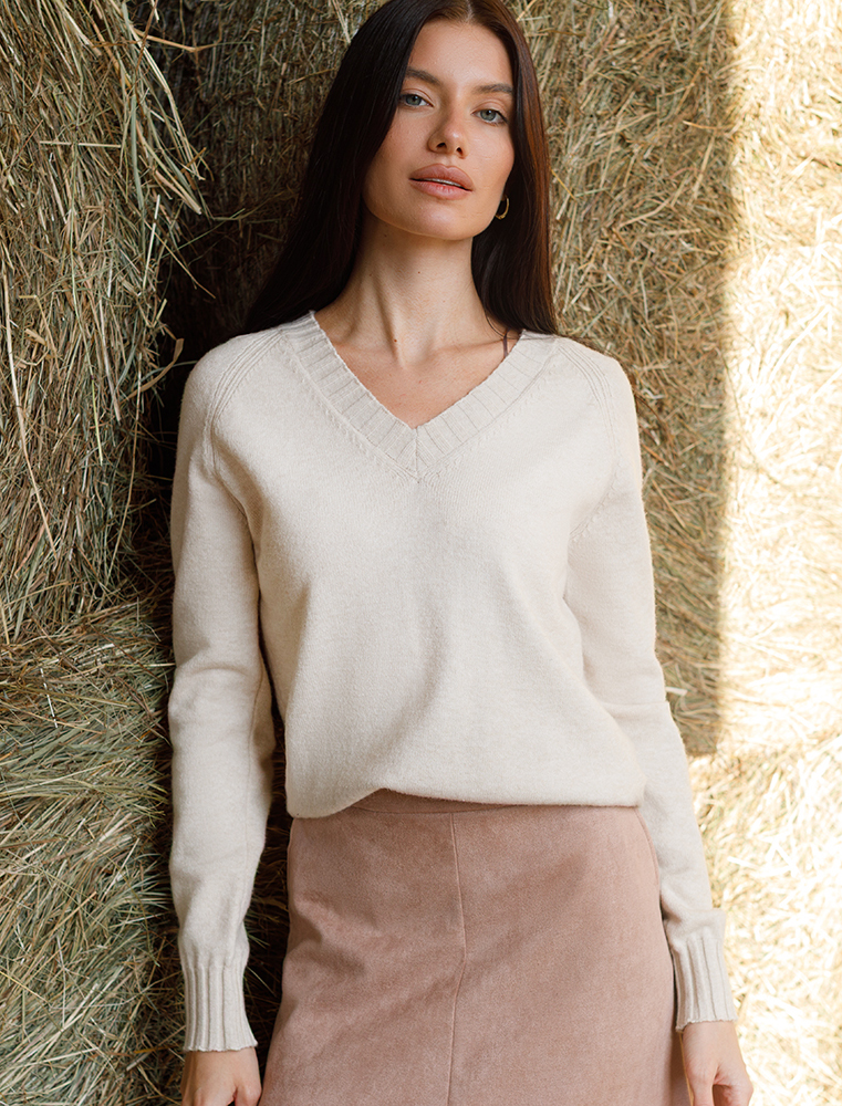 Размер товара на первом фото: 42 Невероятно женственный джемпер овсяного цвета с V вырезом связан из высококачественной пряжи с кашемиром — идеальное сочетание мягкости и практичности. Пряжа с кашемиром придаёт ему бархатистую нежность и тонкую структуру, каждое прикосновение с которой, напоминает о тепле и уюте в прохладные дни. Благодаря нежной текстуре материала этот вариант отлично подходит даже для чувствительной кожи, не вызывая раздражения и дискомфорта в течение дня. Сдержанный, элегантный силуэт джемпера подчёркивает вкуc обладательницы, а филигранная отделка ворота — внимание к деталям. Универсальный оттенок и изящная мягкость делают его идеальным выбором в любой ситуации. Широкие манжеты и нижний край добавляют аккуратности, а продуманная посадка делает повседневный джемпер удобным для многослойных образов — от офисного комплекта, например, в сочетании с блузкой, до расслабленного уикенда. Свободный крой джемпера идеально подходит для женщин, которые ценят удобство и стиль одновременно, а так же идеально подходит на большие размеры. Благодаря качественной пряже свитер сохраняет форму и внешний вид даже после многократных носок. Практичный фасон идеально подходит для работы в офисе или встреч с друзьями. Благодаря классическому крою джемпер гармонично сочетается практически с любыми элементами гардероба, помогая всегда выглядеть актуально. Сочетается в костюме с брюками D38.013, D38.012 и юбкой D36.016 Комментарии к товару
