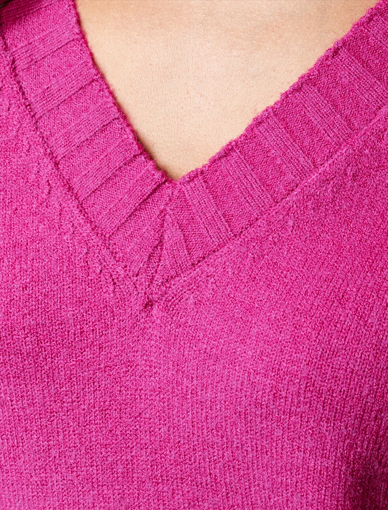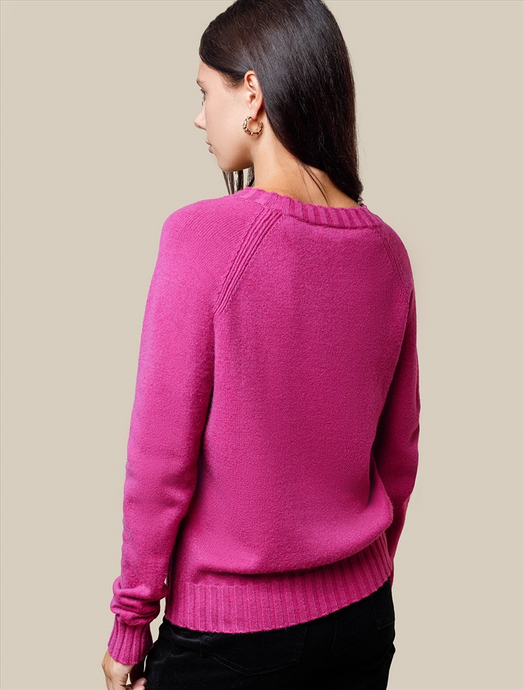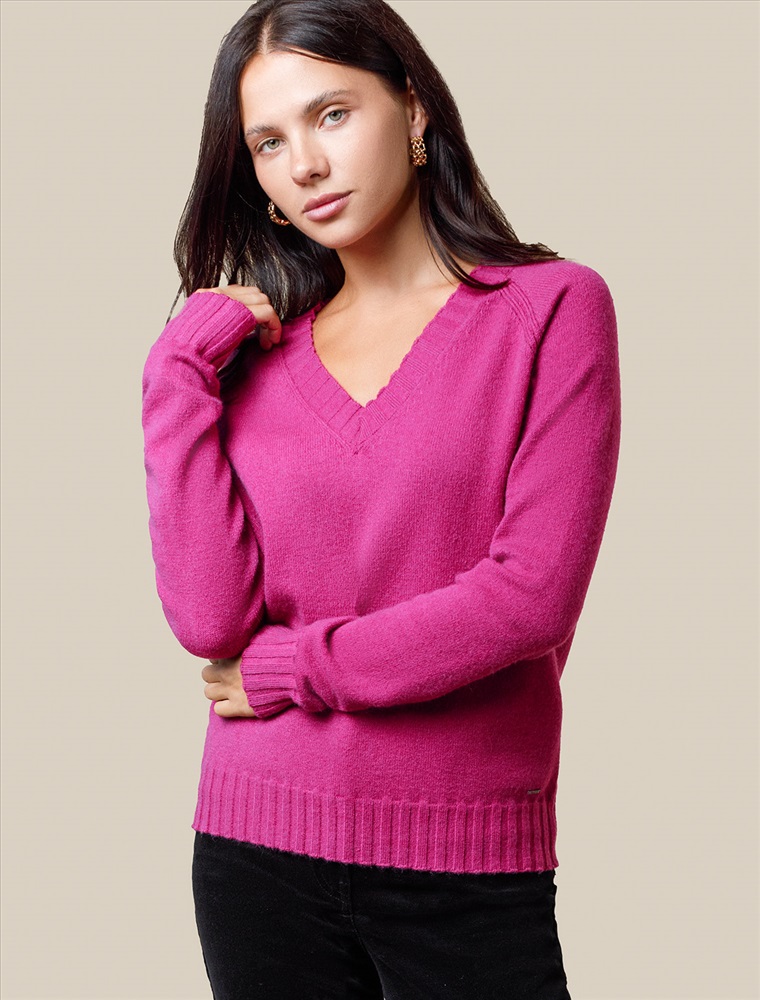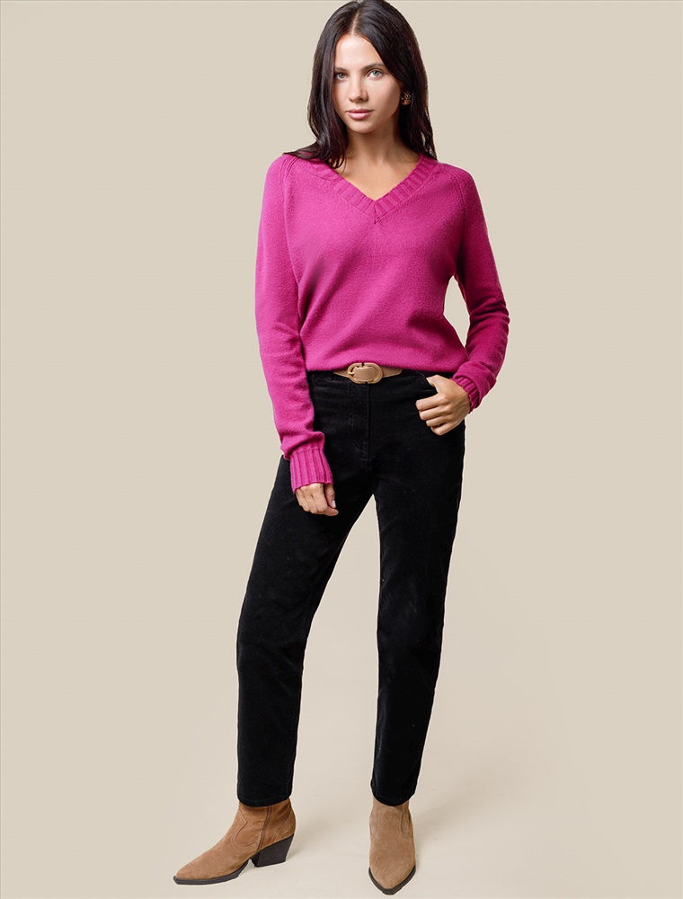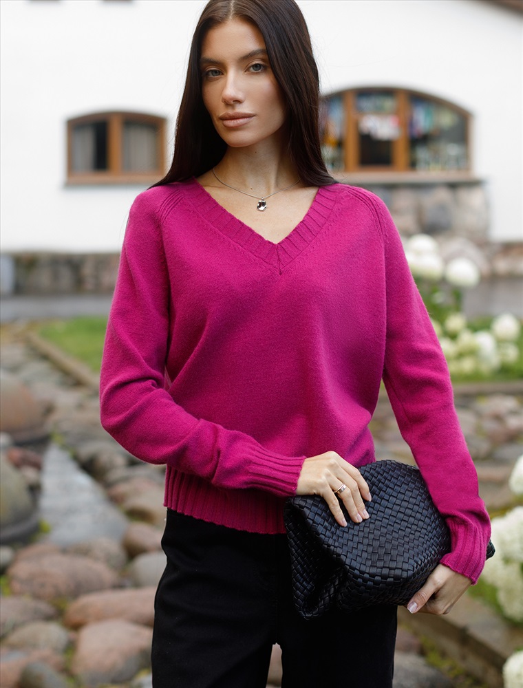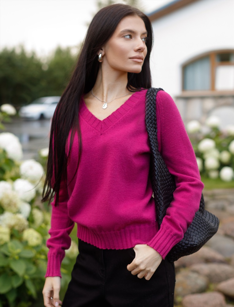 Невероятно женственный джемпер цвета фуксия с V вырезом связан из высококачественной пряжи с кашемиром — идеальное сочетание мягкости и практичности. Пряжа с кашемиром придаёт ему бархатистую нежность и тонкую структуру, каждое прикосновение с которой, напоминает о тепле и уюте в прохладные дни. Благодаря нежной текстуре материала этот вариант отлично подходит даже для чувствительной кожи, не вызывая раздражения и дискомфорта в течение дня. Сдержанный, элегантный силуэт джемпера подчёркивает вкуc обладательницы, а филигранная отделка ворота — внимание к деталям. Яркий оттенок и изящная мягкость делают его идеальным выбором в любой ситуации. Широкие манжеты и нижний край добавляют аккуратности, а продуманная посадка делает повседневный джемпер удобным для многослойных образов — от офисного комплекта, например, в сочетании с блузкой, до расслабленного уикенда. Свободный крой джемпера идеально подходит для женщин, которые ценят удобство и стиль одновременно, а так же идеально подходит на большие размеры. Благодаря качественной пряже свитер сохраняет форму и внешний вид даже после многократных носок. Практичный фасон идеально подходит для работы в офисе или встреч с друзьями. Благодаря классическому крою джемпер гармонично сочетается практически с любыми элементами гардероба, помогая всегда выглядеть актуально. Сочетается в костюме с брюками D38.013, D38.012 и юбкой D36.016