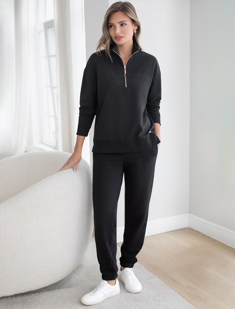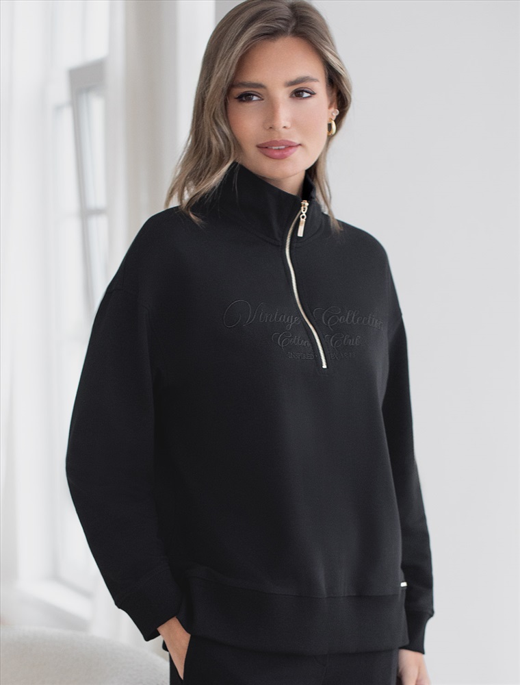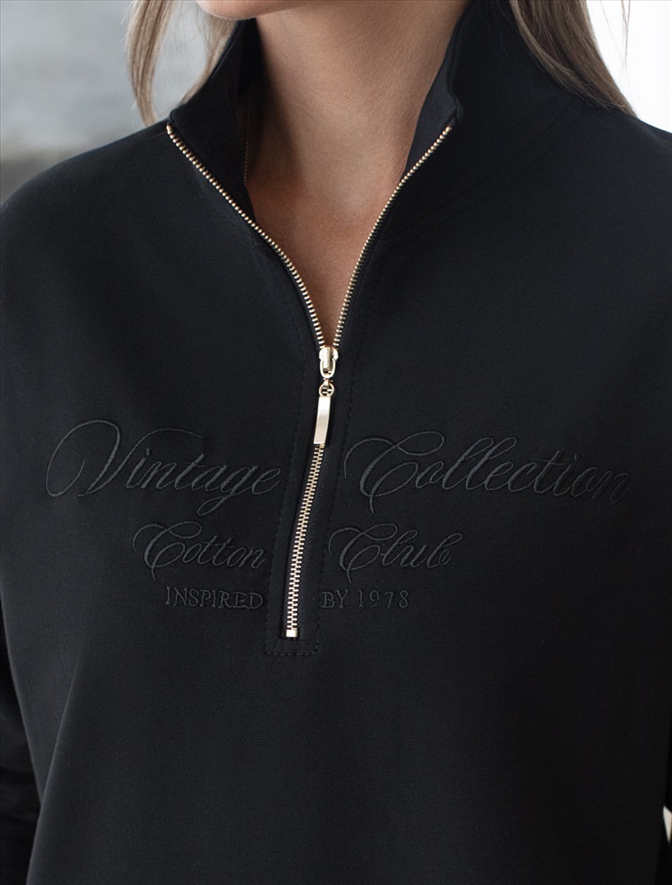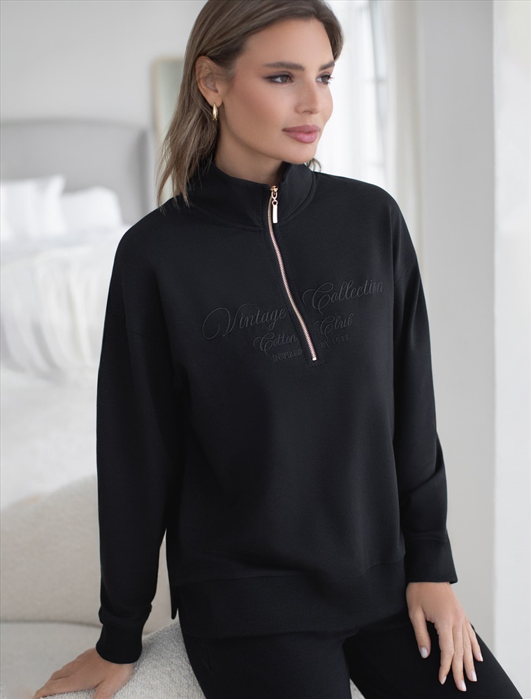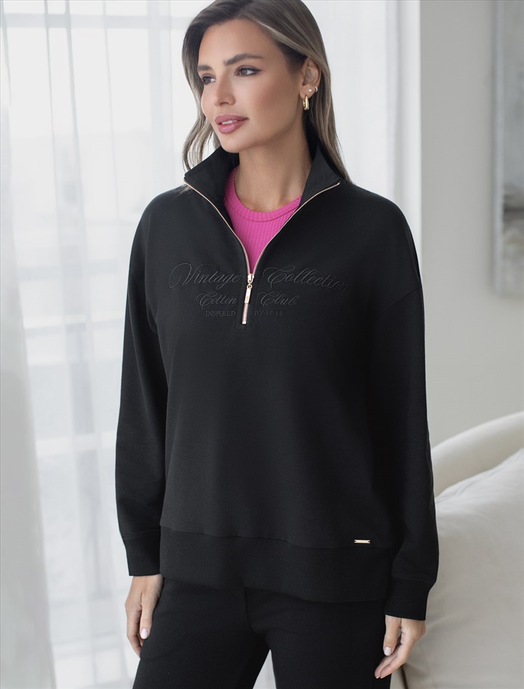 Уютный и комфортный вариант для прохладной погоды – стильный джемпер черного цвета с воротом на молнии. Изготовлен из премиального футера трехнитки с добавлением эластана. Материал сохраняет форму при длительном ношении и после многократных стирок, его мягкая текстура дарит ощущение уюта и тепла. Минималистичная вышивка в тон изделия в виде надписи. еревод надписи: Vinlage collection cotton club - Винтажная коллекция Хлопковый клуб. Свободный крой джемпера позволяет не ограничивать движения, что особенно важно для активного образа жизни. Подойдет на любую женскую фигуру, представлена широкая размерная линейка, большие размеры, легко комбинируется с другими вещами, создавая модные образы в стиле спорт-шик. Этот повседневный джемпер сочетает в себе удобство и актуальность, будет универсальным выбором для отдыха или прогулок.