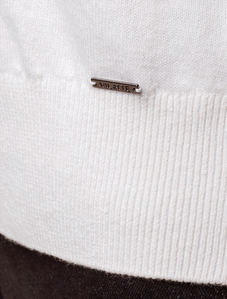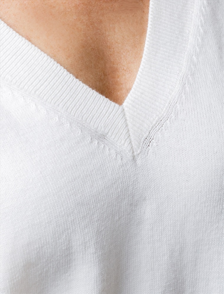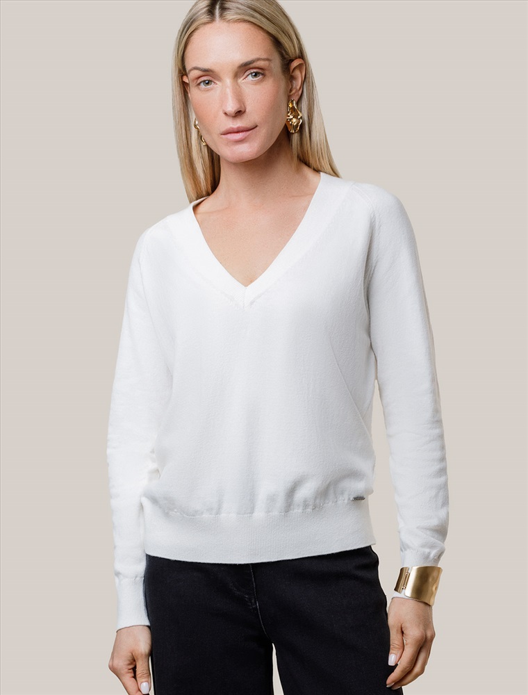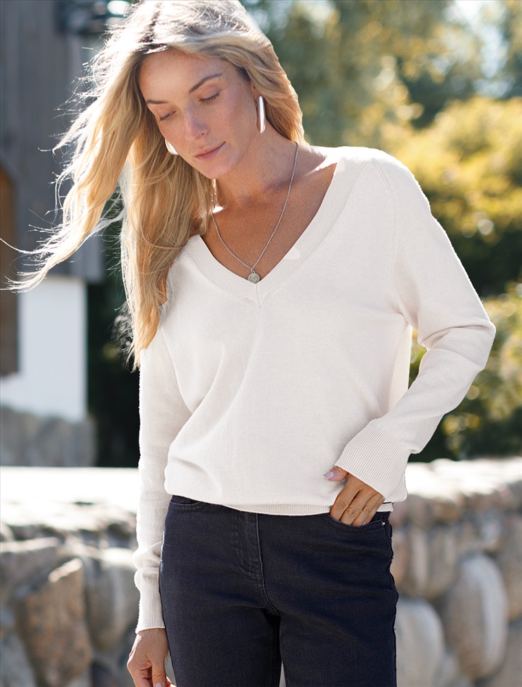Размер товара на первом фото: 42 Джемпер тонкой вязки выполнен из хлопка с добавлением кашемира. Модель с V-вырезом свободного силуэта. Мягкая и очень приятная пряжа в рубчик совершенно не колется, сохраняет тепло при этом не перегревая, гарантируя безупречный комфорт.