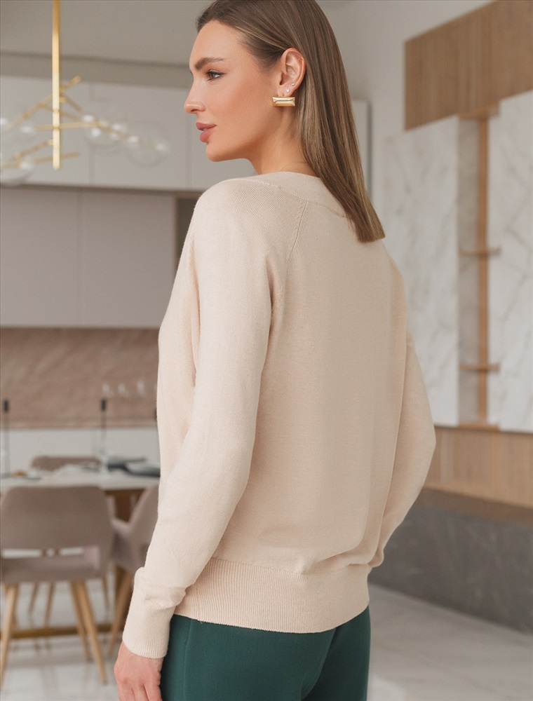 Размер товара на первом фото: 42 Джемпер тонкой вязки выполнен из хлопка с добавлением кашемира. Модель с V-вырезом свободного силуэта. Мягкая и очень приятная пряжа в рубчик совершенно не колется, сохраняет тепло при этом не перегревая, гарантируя безупречный комфорт. Комментарии к товару