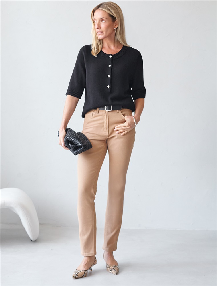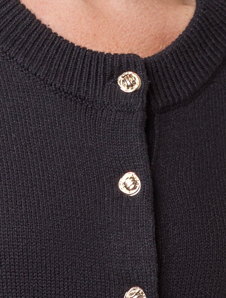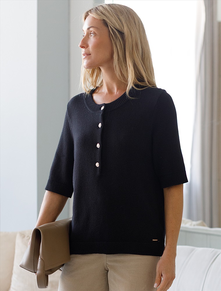 Размер товара на первом фото: 42 Джемпер тонкой вязки выполнен из хлопка с добавлением кашемира. Модель с круглым вырезом дополнена золотистыми пуговицами. Мягкая и очень приятная пряжа совершенно не колется, сохраняет тепло при этом не перегревая, гарантируя безупречный комфорт.