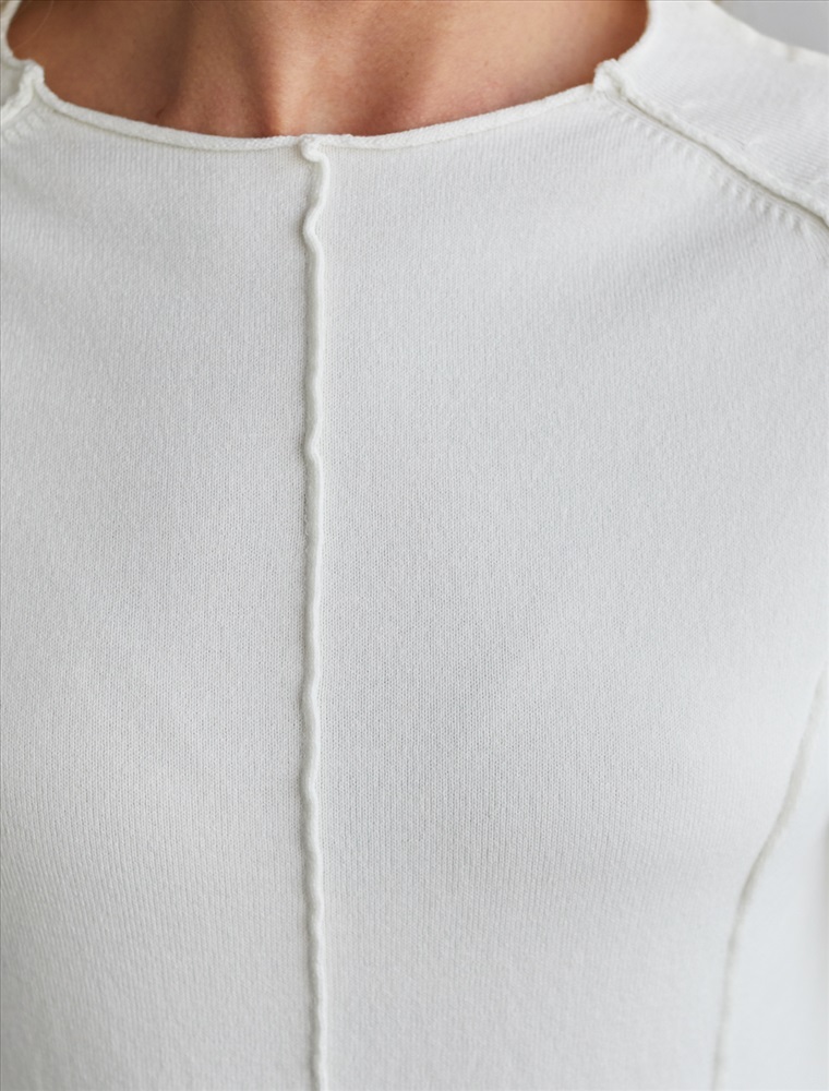 Размер товара на первом фото: 42 Джемпер тонкой вязки выполнен из мягкой хлопковой пряжи. Модель с декоративными швами идеально сидит по фигуре подчеркиваяч изгибы тела. Подходит для любой фигуры и впишется в любой гардероб. Изделие дополнено металлическим логотипом бренда.