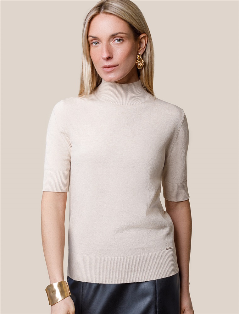 Размер товара на первом фото: 42 Джемпер тонкой вязки выполнен из мягкой хлопковой пряжи. Модель свободно сидит по фигуре не сковывая движений. Подходит для любой фигуры и впишется в любой гардероб. Изделие дополнено металлическим логотипом бренда.