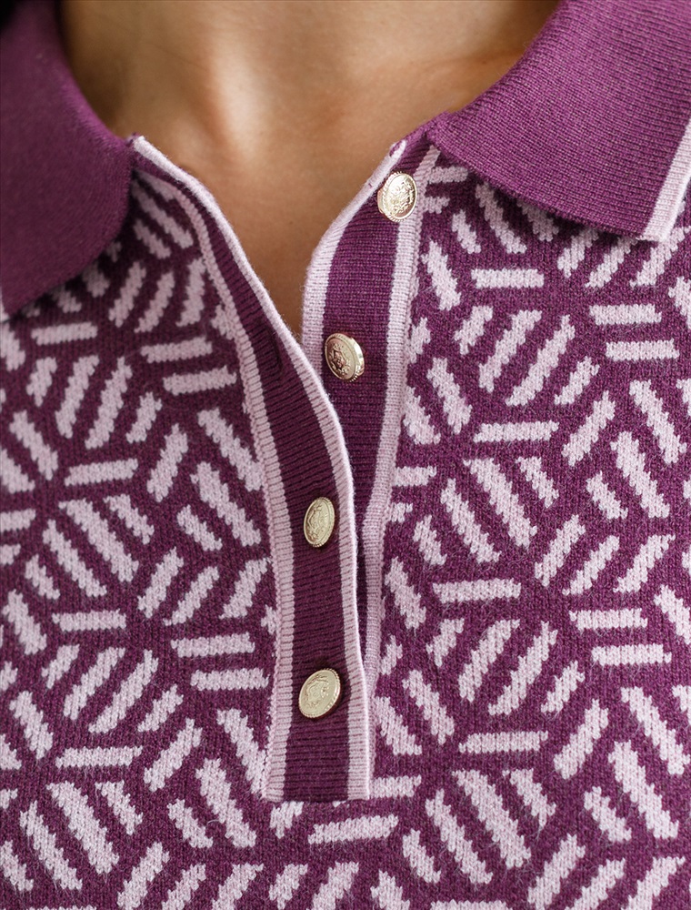 Джемпер жаккардовой вязки выполнено из нежной пряжи на основе вискозы с добавлением кашемира. Модель прямого силуэта с застежкой планкой как у поло. Фигурные золотистые пуговицы вносят изысканности и роскоши. Изделие приятно ощущается на теле и поддерживает комфортный микроклимат. Сочетается в комплекте total-look с жакетом D31.150