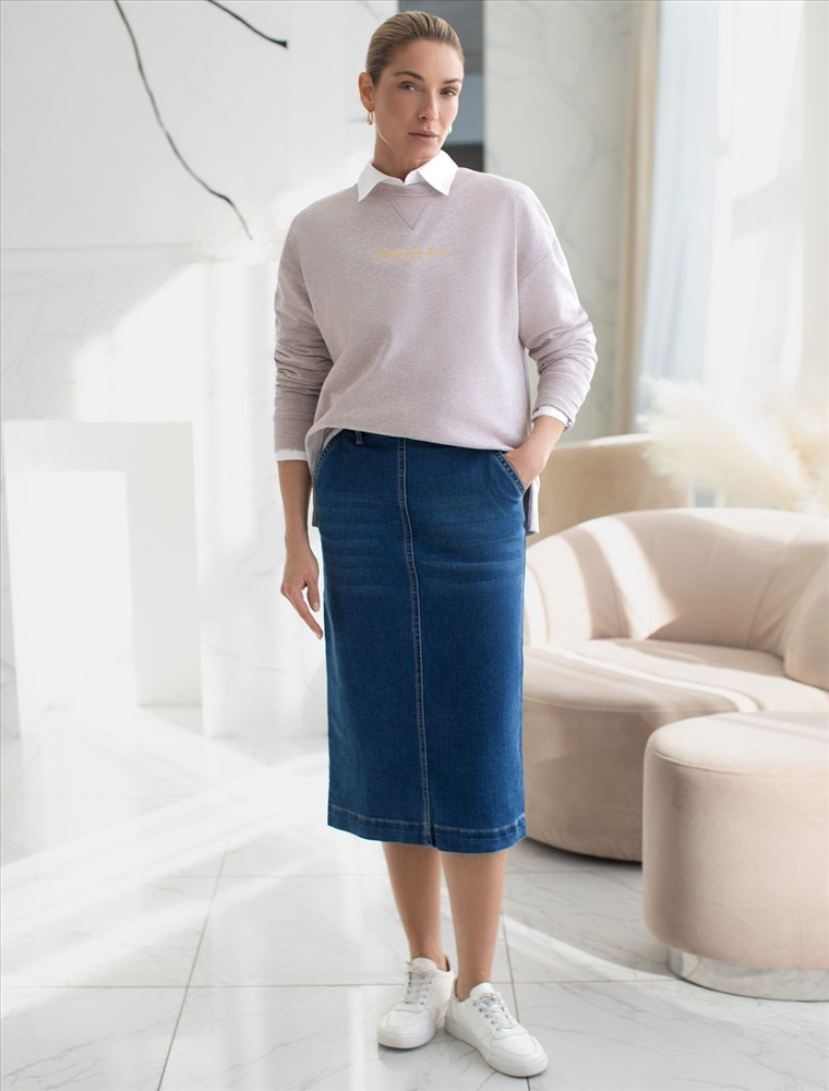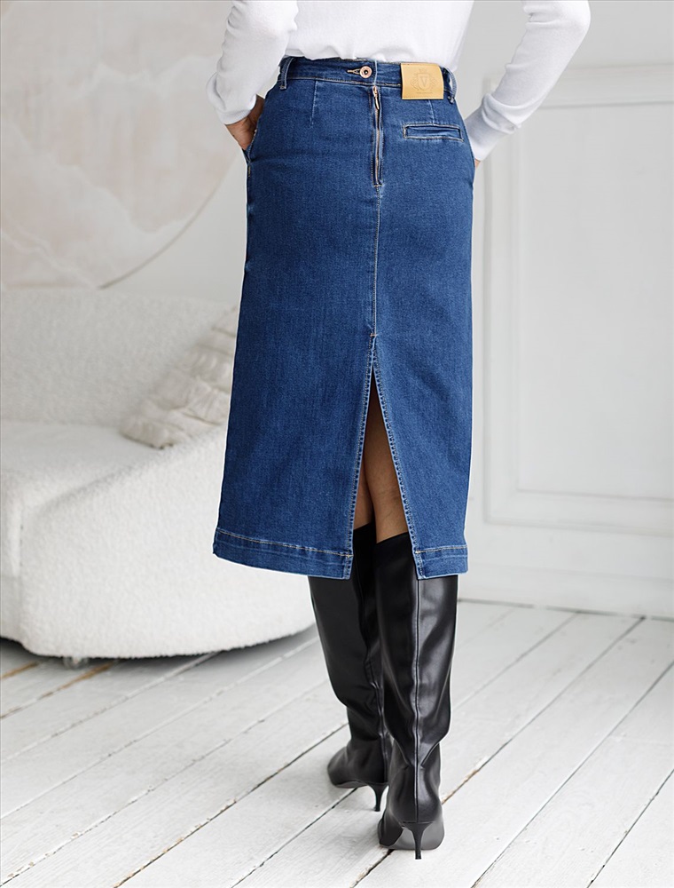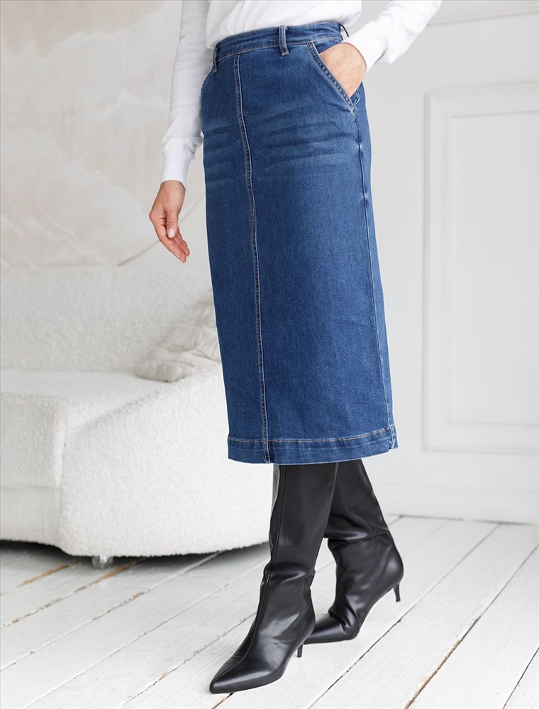 Лаконичная джинсовая юбка красивого синего цвета из эластичного денима идеально подходит для создания женственного образа в любое время года, особенно в осенний период. Прямой фасон с высокой посадкой формирует аккуратный силуэт, подчеркивая достоинства фигуры и обеспечивая комфорт при ходьбе. Контрастные швы, отрезанный гладкий край понизу без подгибки и легкая декоративная стирка добавляют современности образу. Особенностью является разрез , который делает повседневную юбку более динамичной и удобной для прогулок или работы в офисе.