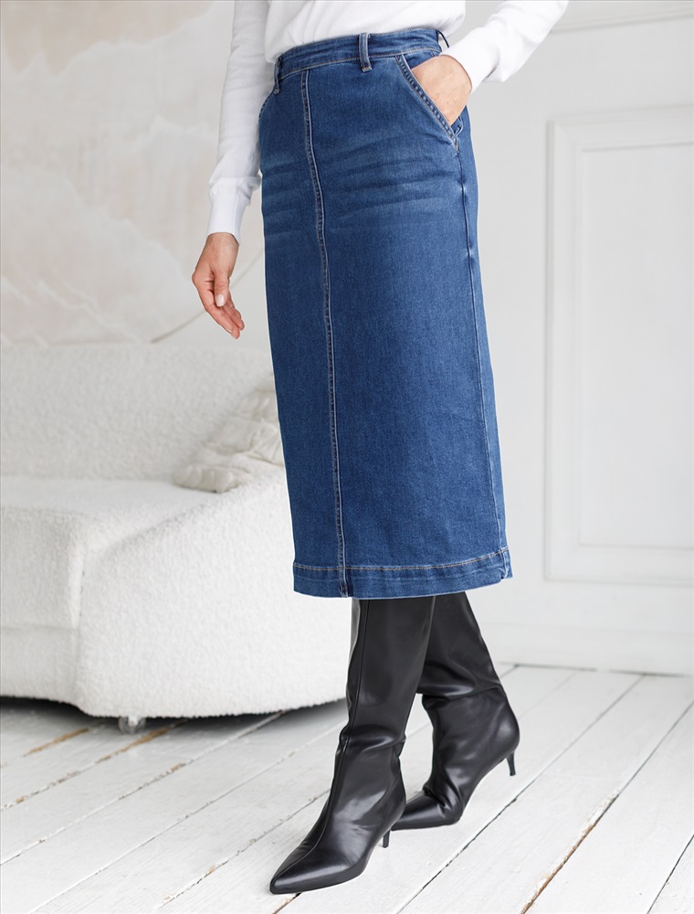 Размер товара на первом фото: 42 Лаконичная джинсовая юбка красивого синего цвета из эластичного денима идеально подходит для создания женственного образа в любое время года, особенно в осенний период. Прямой фасон с высокой посадкой формирует аккуратный силуэт, подчеркивая достоинства фигуры и обеспечивая комфорт при ходьбе. Контрастные швы, отрезанный гладкий край понизу без подгибки и легкая декоративная стирка добавляют современности образу. Особенностью является разрез , который делает повседневную юбку более динамичной и удобной для прогулок или работы в офисе. Высокая посадка , фасон карандаш и декоративный прямой шов спереди, визуально удлиняют ноги, вытягивают силуэт. Застежка на молнию обеспечивает удобство надевания и надежную фиксацию. У джинсовой юбки предусмотрены два аккуратных боковых кармана и один задний карман – маленькие детали, которые добавляют практичности без лишнего объема. Премиальная фурнитура гарантирует долговечность. На поясе брендированный патч из эко-кожи. Эластичная ткань адаптируется под любую фигуру, подходит на маленькие и большие размеры. Универсальная длина позволяет сочетать повседневную юбку с разной обувью — от высоких сапог до обуви на плоском ходу, что делает ее отличным выбором для осени и позднего лета. Комментарии к товару