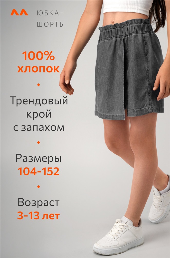Преимущества: — 100% хлопок; — плотный, но приятный к телу деним; — свободный крой не сковывает движений; — широкая эластичная резинка на талии мягко прилегает; — декоративные отстроченные швы подчеркивают аккуратность. Короткая юбка с запахом подойдет для прогулок. Детская серая юбка длины мини легко справляется с задачей выглядеть красиво + чувствовать себя комфортно. Модель Василиса, рост 117 см, параметры 52-53-60 см. На ней размер 116. Модель Любовь, ее рост 145 см, параметры 68-56-74 см. На ней размер 146.