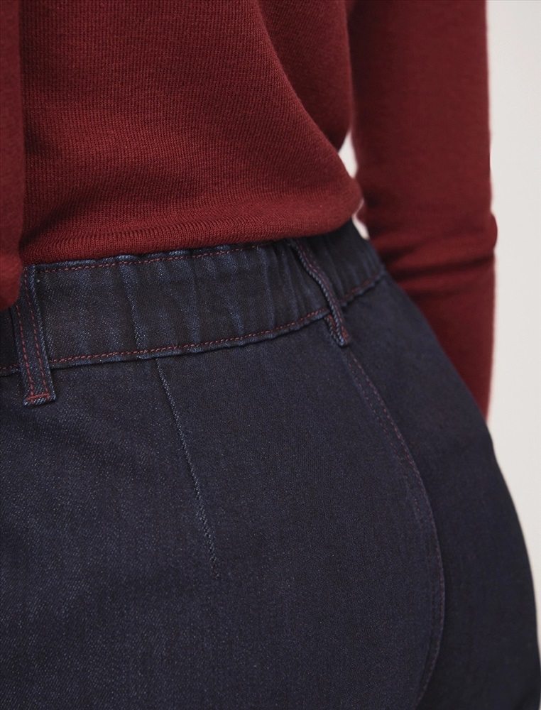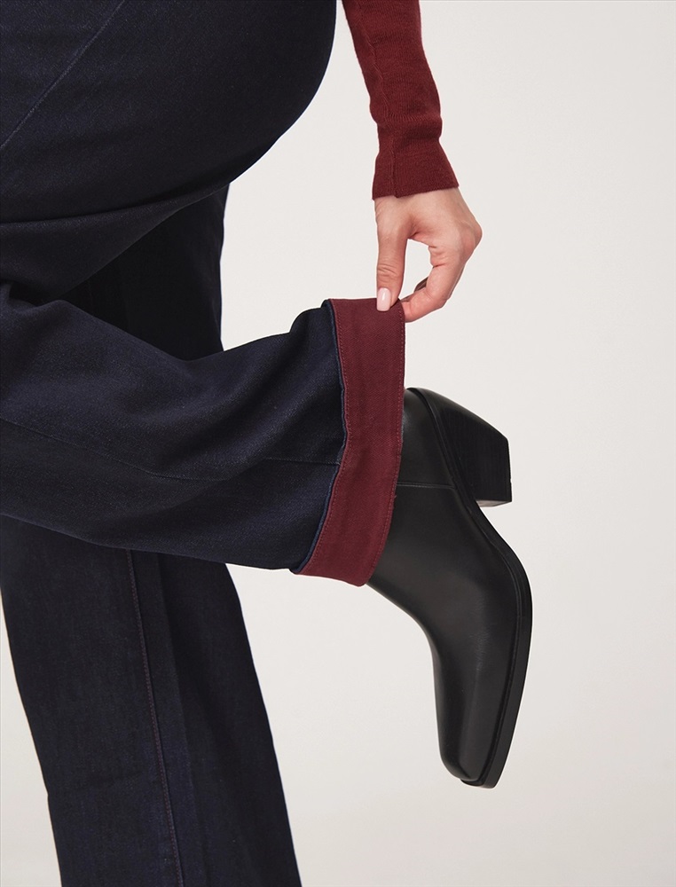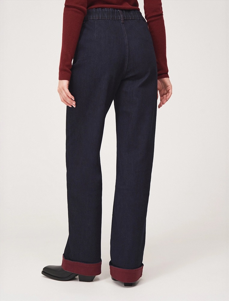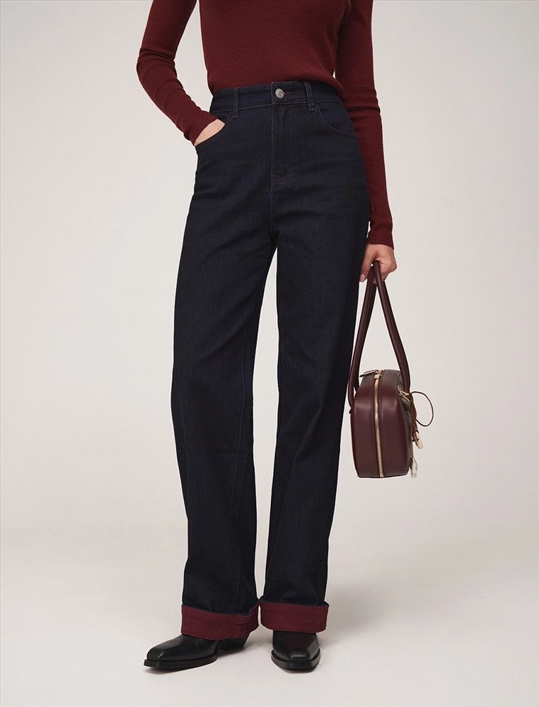 Джинсы прямого силуэта с посадкой на уровне талии. Спереди классический гульфик и застежка на молнию. По бокам врезные карманы. По поясу шлевки. Сзади кокетка и накладные карманы. Ткань верха из «сырого» денима. По низу подвороты в бордовом оттенке.
