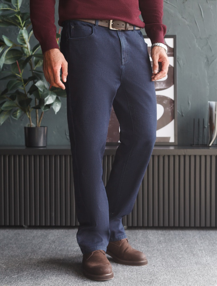 Теплые джинсы темно-синего цвета прямого кроя созданы для мужчин, ценящих комфорт и стиль даже в холодную осень или зиму. Повседневные джинсы выполнены из эластичного денима, легко тянутся и не сковывают движений, обеспечивая правильный баланс между свободой и удобной посадкой Regular Fit. Внутри мягкий флис дарит приятные ощущения, надежно согревают в холодную погоду и делают каждую прогулку максимально комфортной. Свободный классический крой подходит на разныетипы фигур, в том числе и большие размеры. Правильная посадка гарантирует удобство и комфортные ощущения при носке. Джинсы дополнены пятью карманами и брендированным патчем на поясе. Джинсы удобные на все случаи жизни: они сохраняют форму, не деформируются при носке и обеспечивают оптимальную теплоизоляцию. Утепленный материал создает дополнительный уровень защиты от холода, что делает изделие надежным выбором на зиму и осень. Комфортные брюки отлично сочетаются с разными образами благодаря универсальному дизайну. Они подходят тем, кто ценит практичность и стиль без компромиссов по качеству.