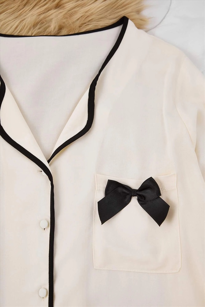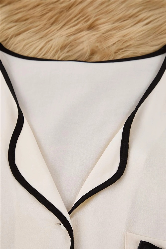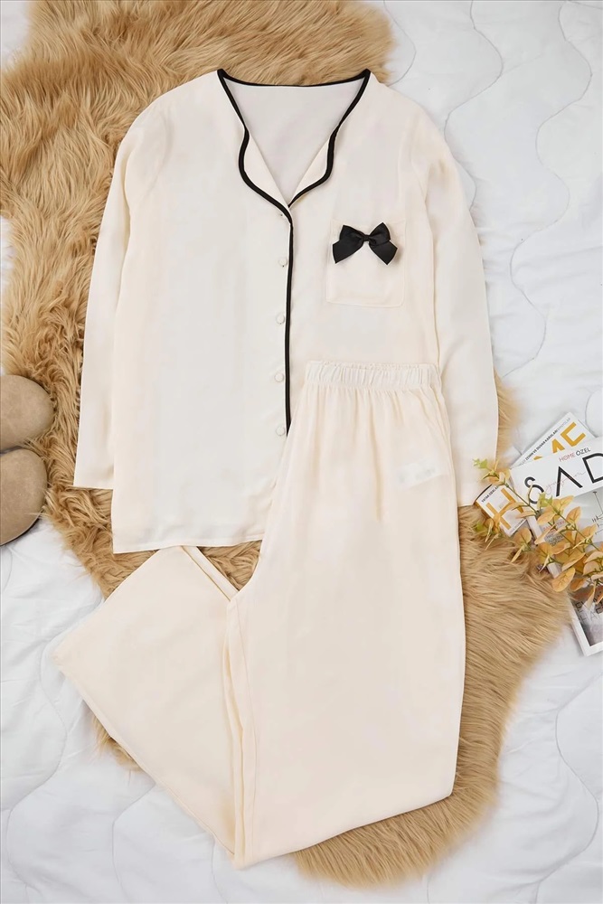Ekru Kurdele/Fiyonk ve Biye Detaylı Viskon Dokuma Pijama Takımı TBBAW26AI00042