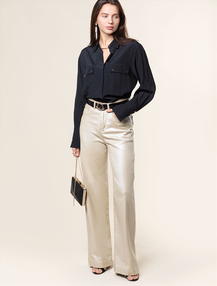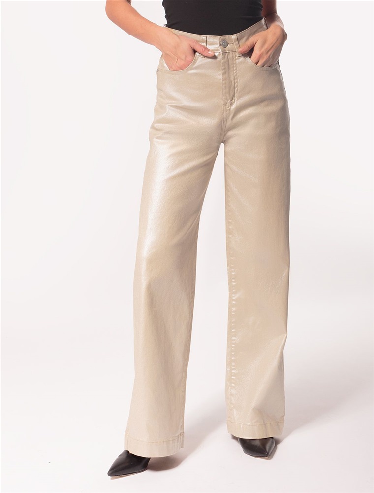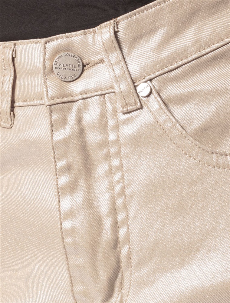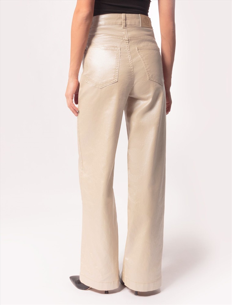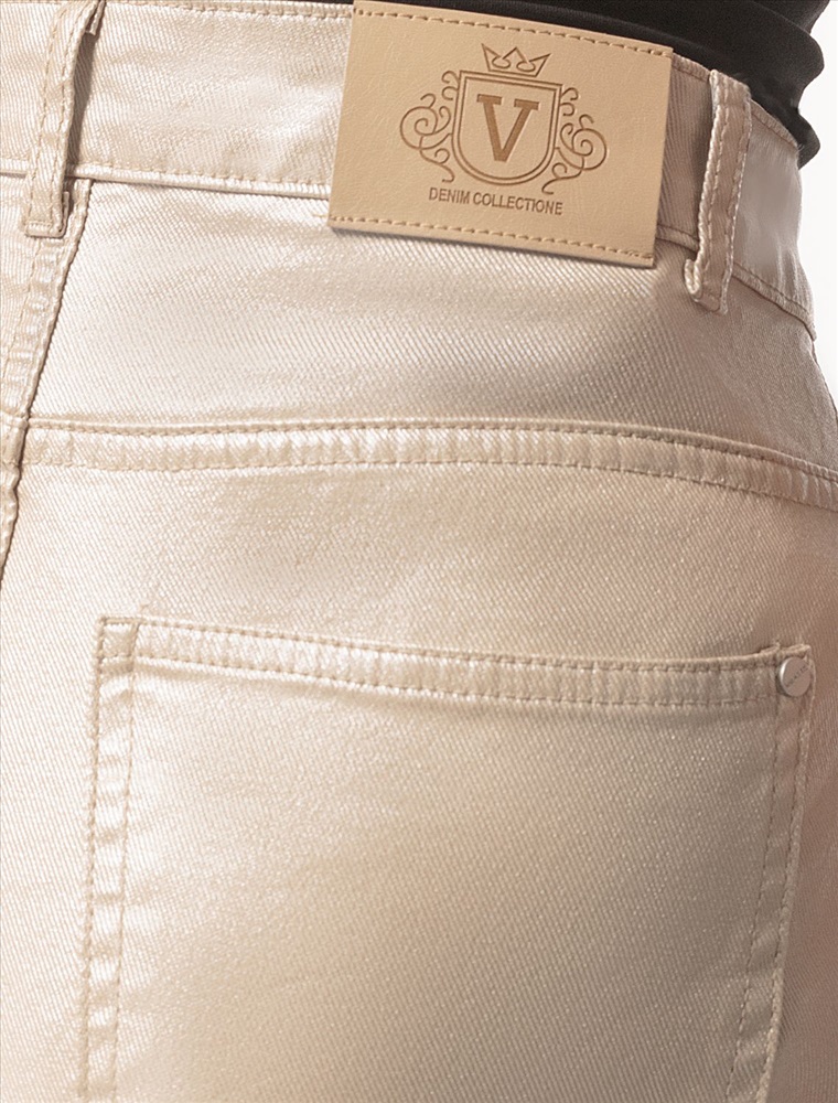 Джинсы выполнены из эластичного денима с легким металлизированным покрытием. Супер-трендовая модель свободного кроя с высокой посадкой на талии. Цвет бежевой фольги с мягким жемчужным сиянием подходит любому цветотипу и сочетается со множеством других оттенков верхов. Плотная ткань хорошо держит форму не сковывая движений.