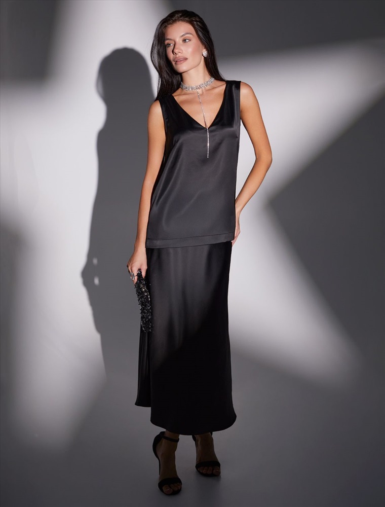 Этот топ идеально подойдет для создания стильного ансамбля на вечерние мероприятия или важные события. Благодаря сочетанию элегантности и практичности, такая стильная блузка без рукавов станет незаменимой частью гардероба для женщин, которые ценят качество и комфорт в одежде. Благородный блеск сатина добавляет нотку роскоши в повседневный гардероб и гармонично сочетается с разными стилями одежды: офисными брюками, джинсами или юбками. V-образный вырез визуально вытягивает шею и создает элегантный акцент в зоне декольте, делая образ более открытым и современным.