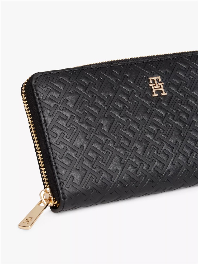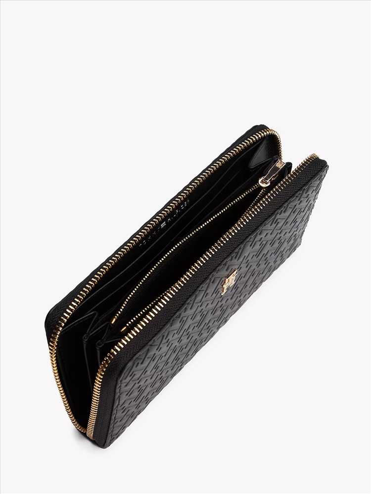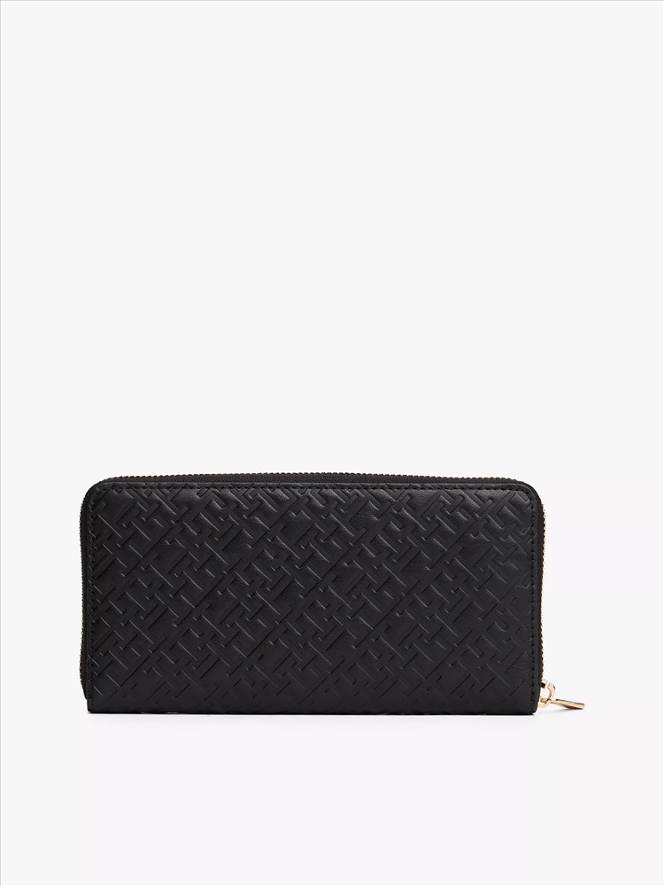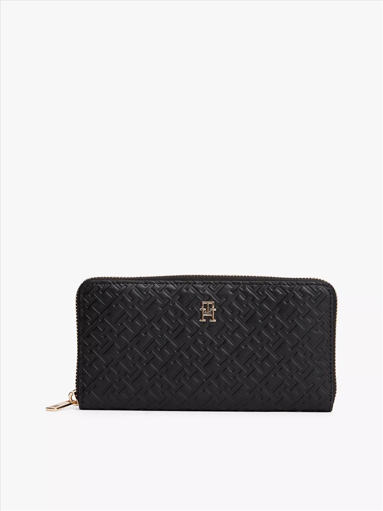 Tommy Hilfiger women's wallet. Keep a sleek profile with our zip-around wallet, finished in an embossed allover monogram design. Inside, there's plenty of room for your cards and currency.