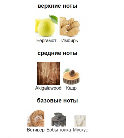 Верхние ноты: Бергамот и Имбирь; средние ноты: Akigalawood и Кедр; базовые ноты: Бобы тонка, Ветивер и Мускус.