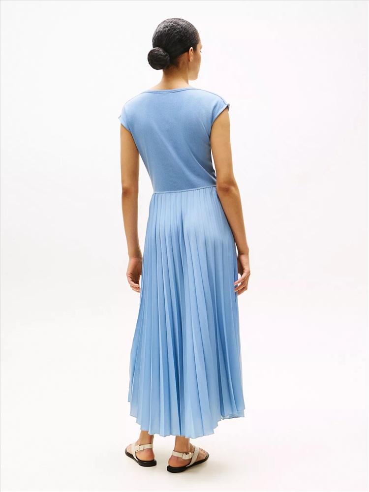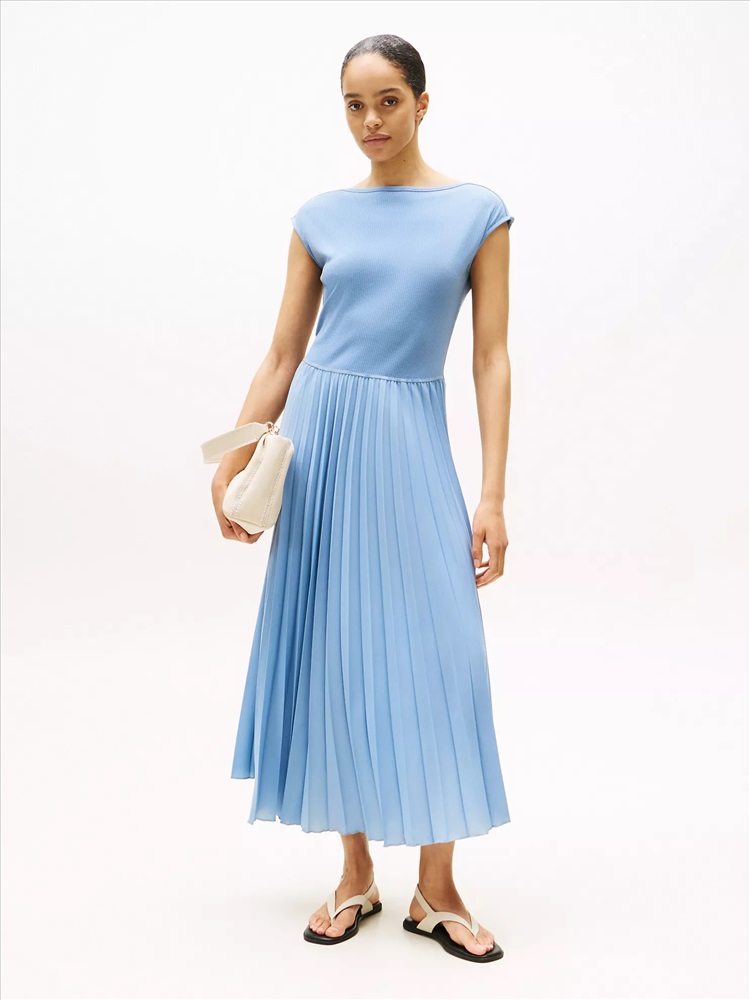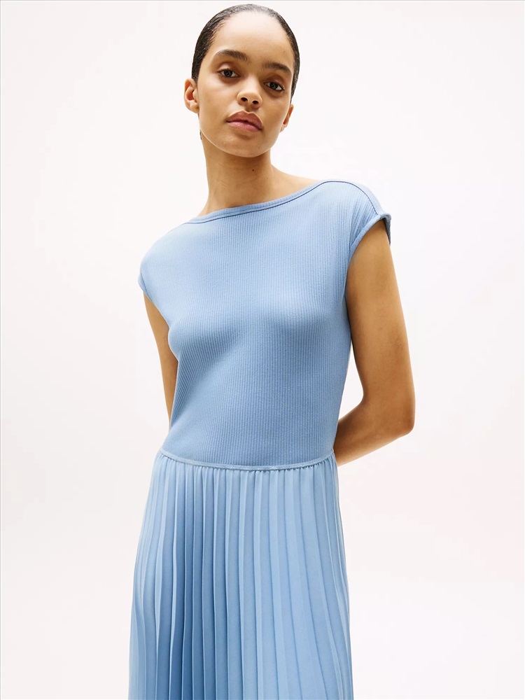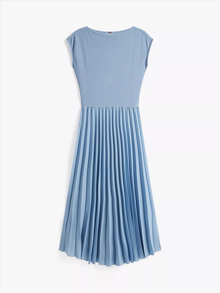 Tommy Hilfiger women's dress. Everyday versatility meets elevated style with our fit-and-flare midi dress, featuring a flowy pleated skirt and a ribbed bodice with cap sleeves. Made from soft, lightweight viscose with a hint of stretch.