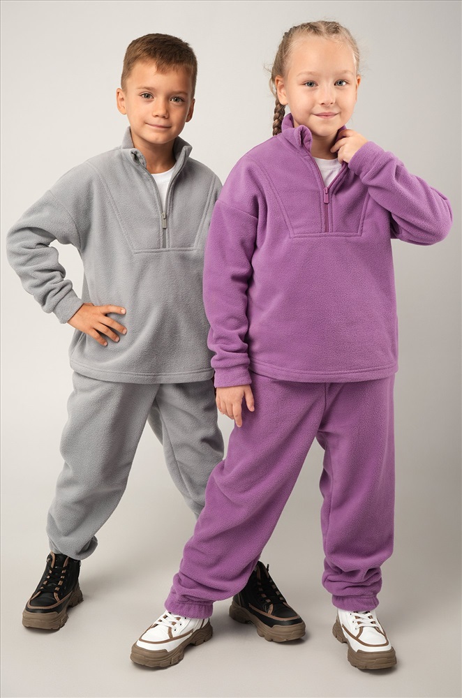 Толстовка прямого кроя со спущенным плечом и брюки на резинке создают комфортный силуэт для активных прогулок. Зимний флисовый костюм идеально подойдёт для детей: он тёплый, базовый и станет незаменимым вариантом на зиму.