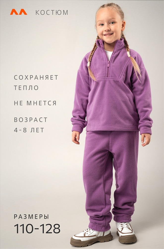 Флисовый костюм — базовый выбор, который дарит уверенность родителям и комфорт малышам. Детский костюм создан для того, чтобы девочке было тепло и удобно каждый день. Сиреневый акцент для зимней стужи!