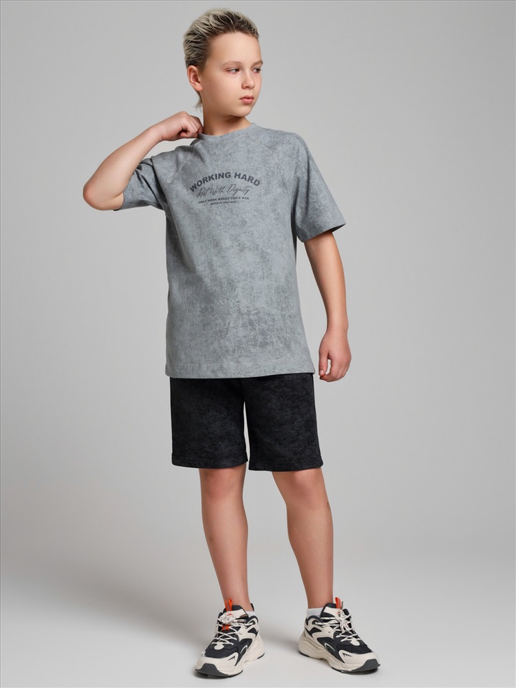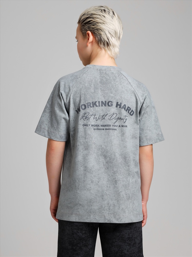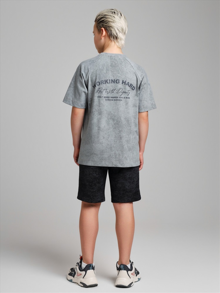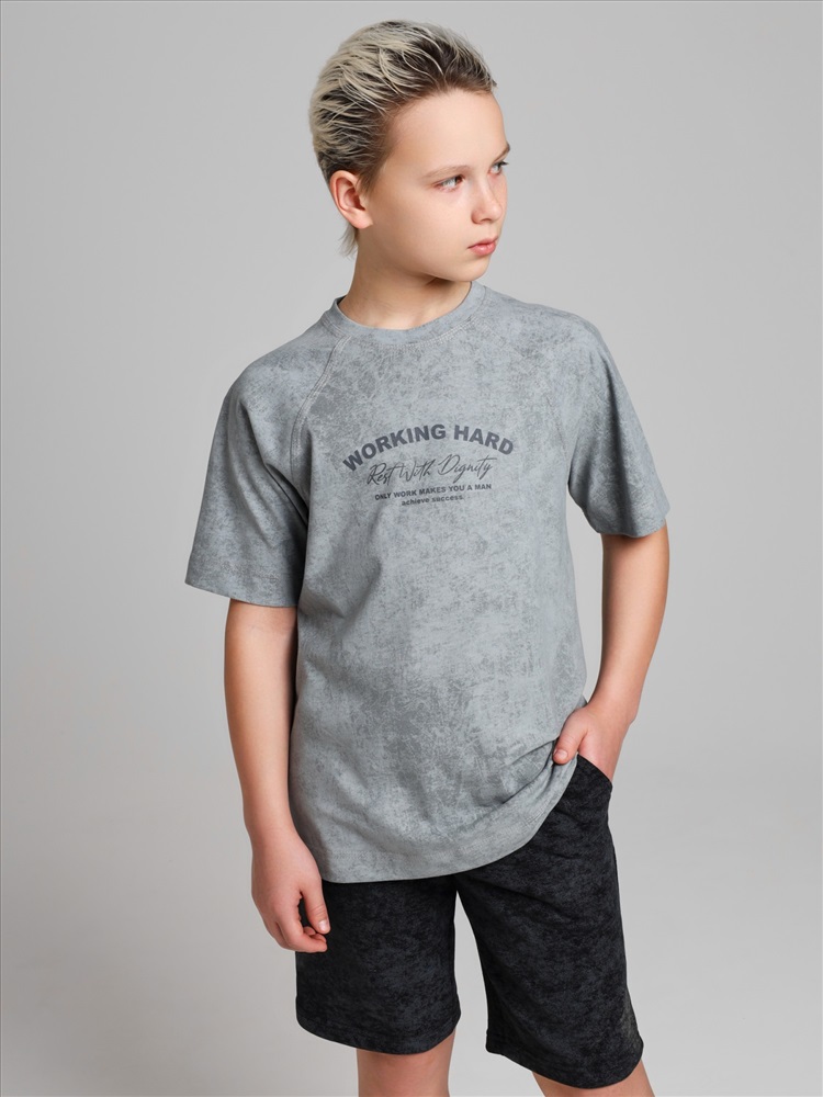 Футболка для мальчика из трикотажного полотна "кулирка-варенка", с короткими рукавами покроя "реглан", горловиной овальной формы, обработанной втачной планкой, и принтом в центре детали переда, выполненным в технике шелкографии. По швам реглана и горловине настрочены отделочные строчки.