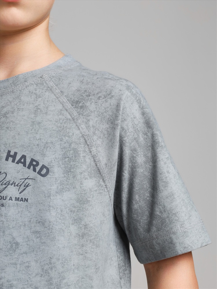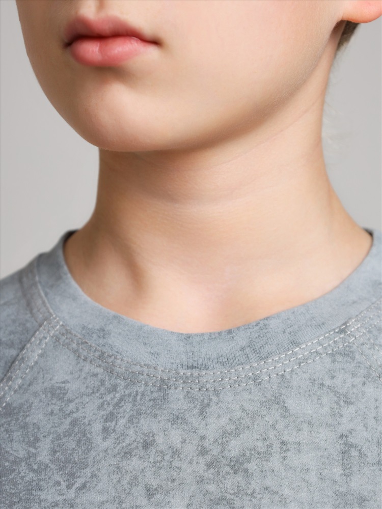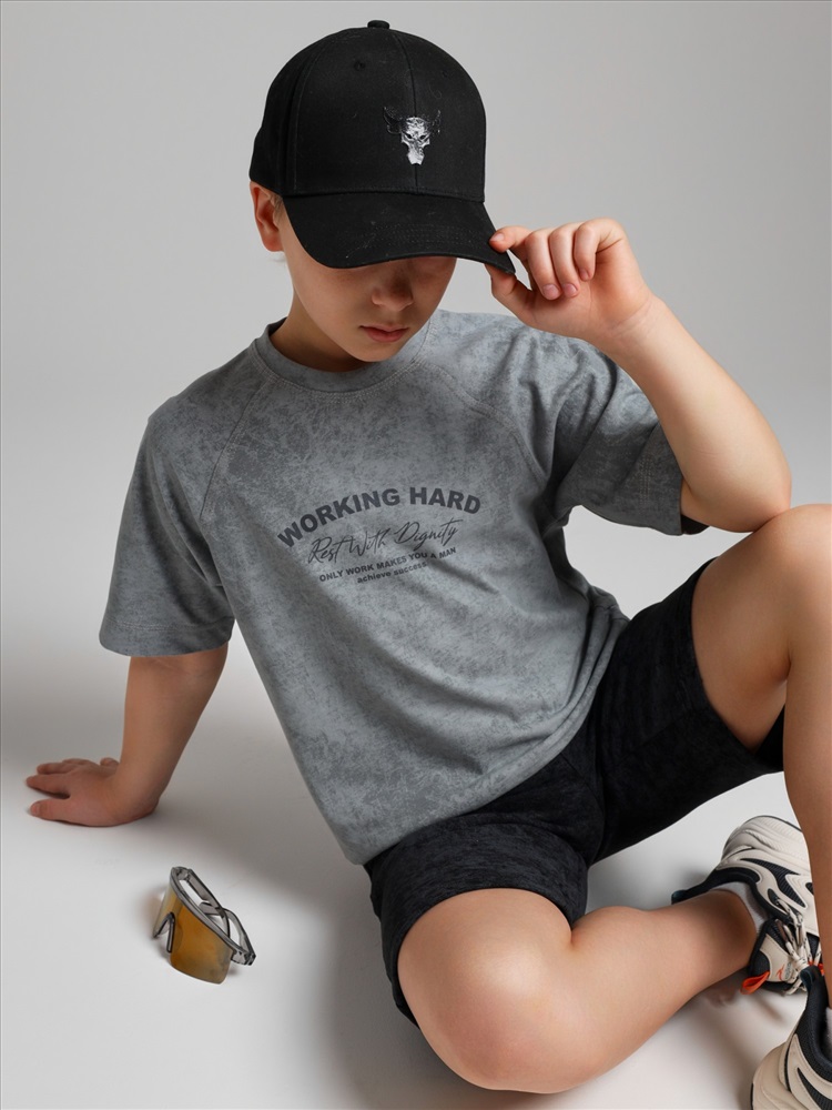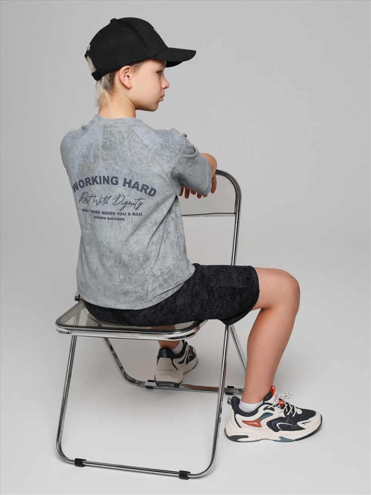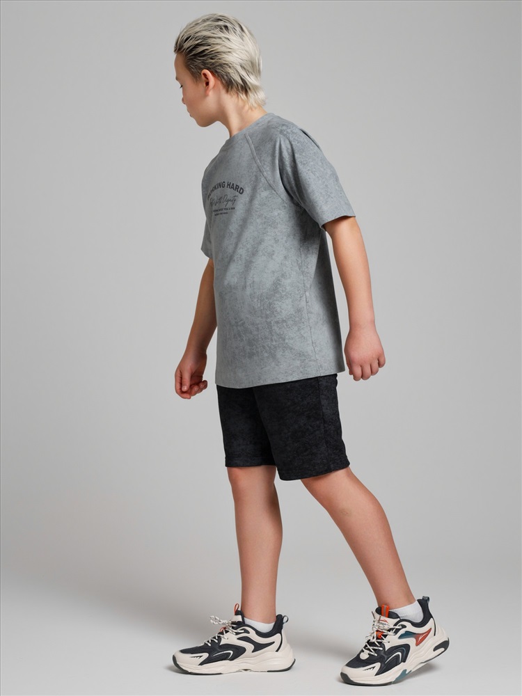 Футболка для мальчика из трикотажного полотна "кулирка-варенка", с короткими рукавами покроя "реглан", горловиной овальной формы, обработанной втачной планкой, и принтом в центре детали переда, выполненным в технике шелкографии. По швам реглана и горловине настрочены отделочные строчки.