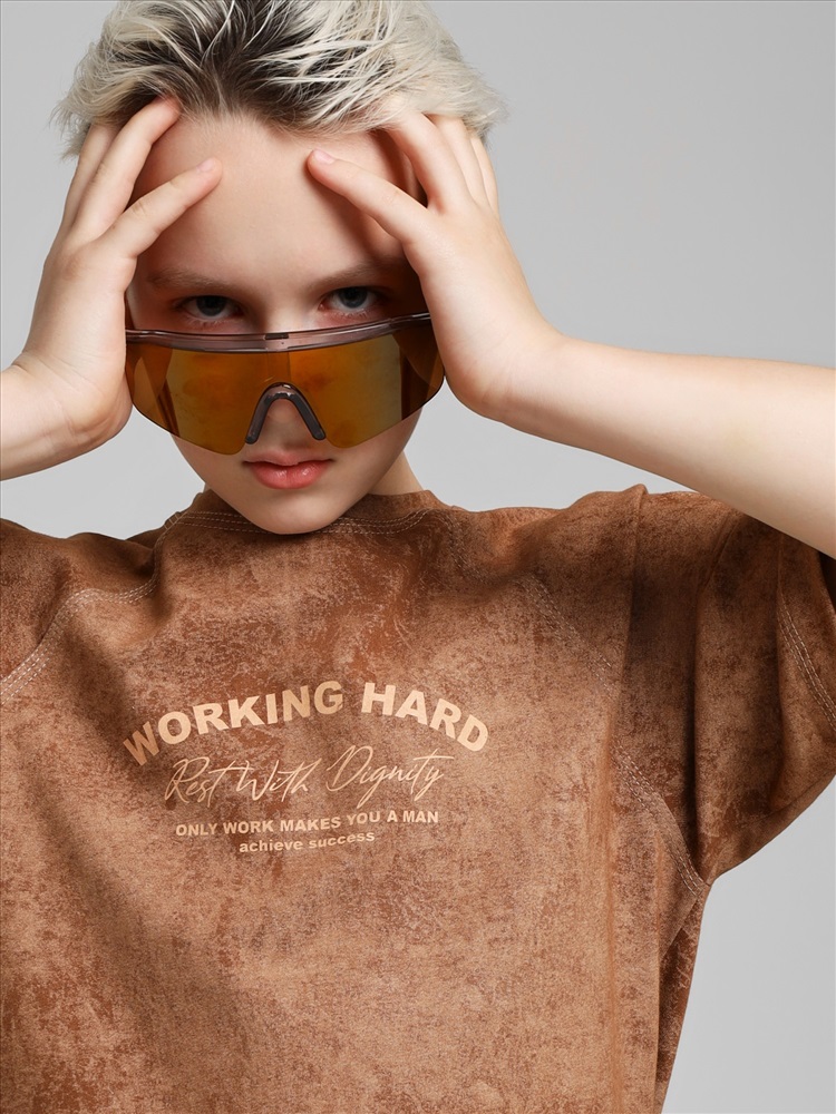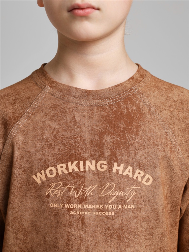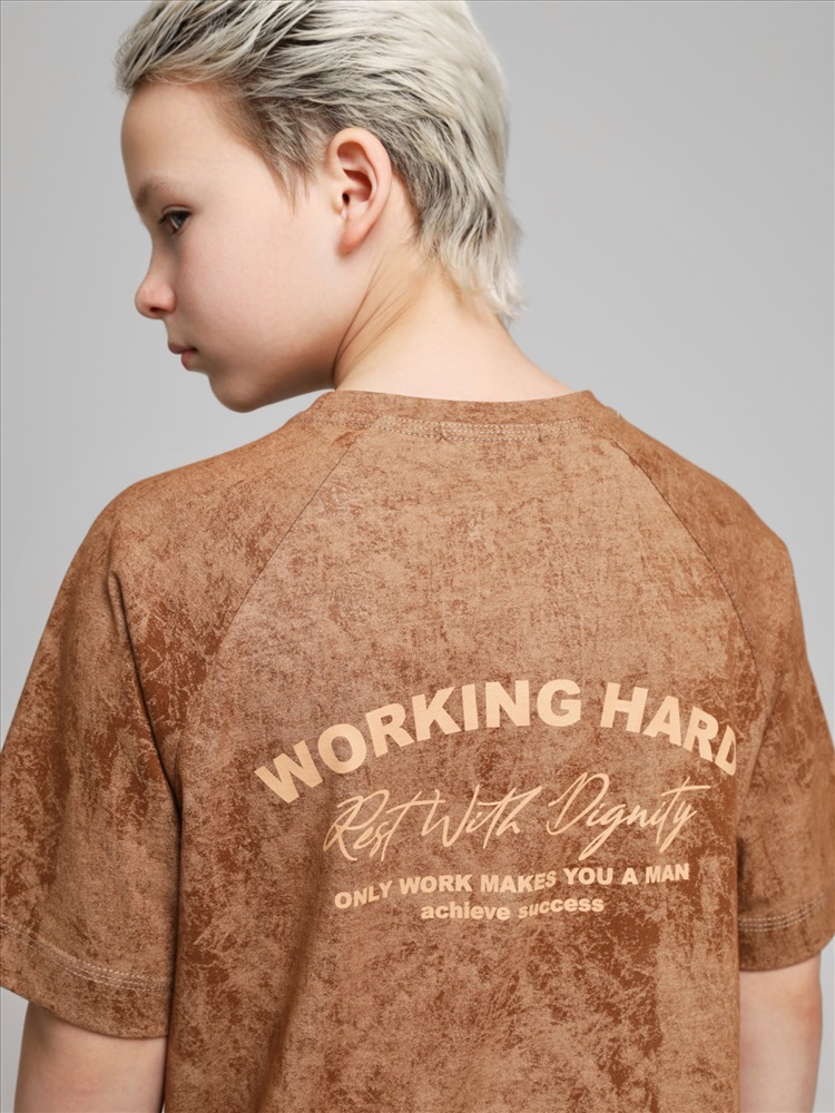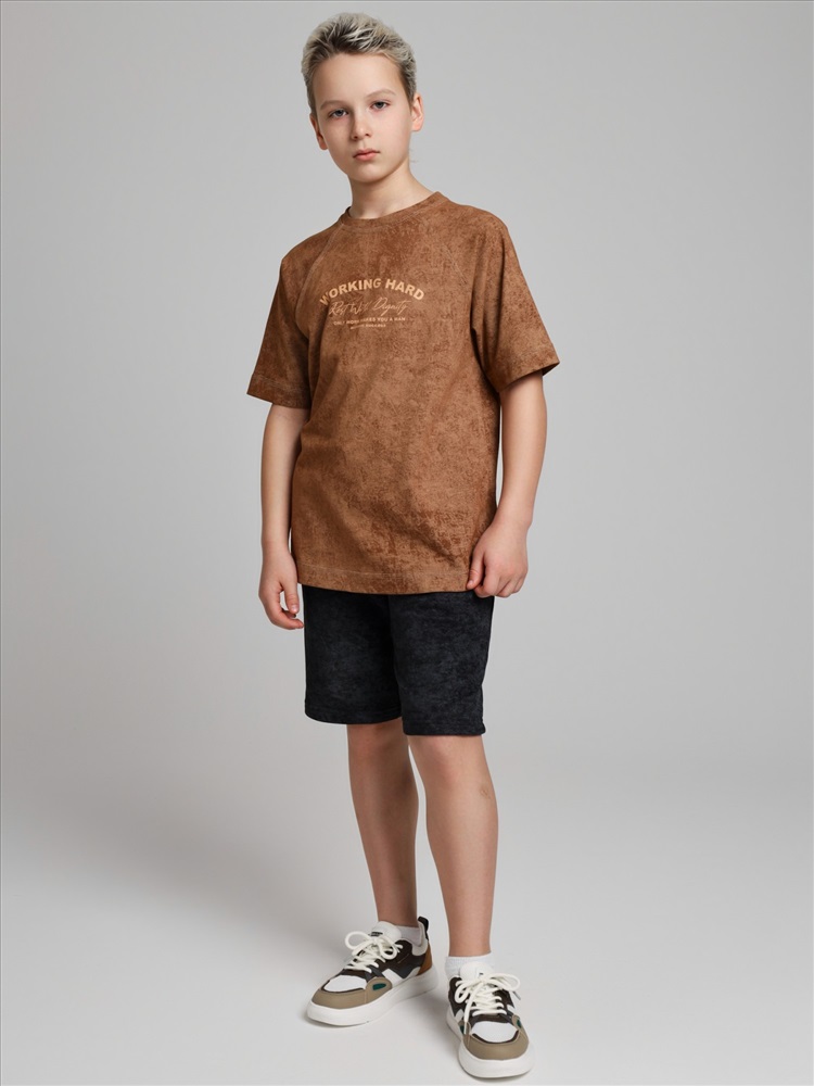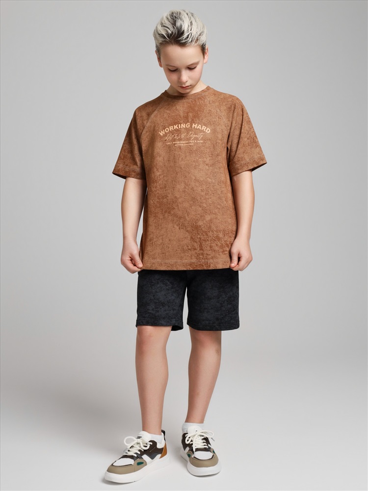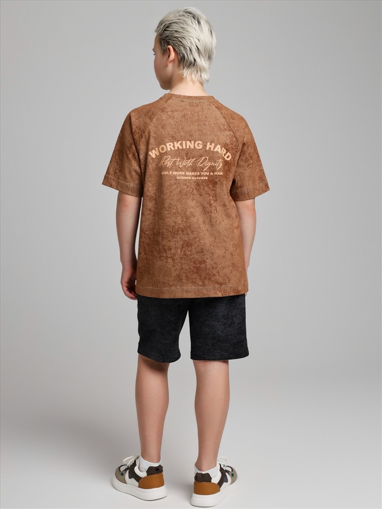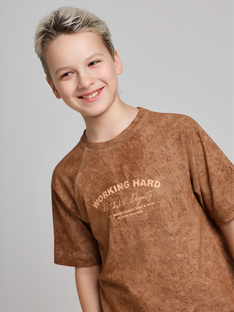 Футболка для мальчика из трикотажного полотна "кулирка-варенка", с короткими рукавами покроя "реглан", горловиной овальной формы, обработанной втачной планкой, и принтом в центре детали переда, выполненным в технике шелкографии. По швам реглана и горловине настрочены отделочные строчки.