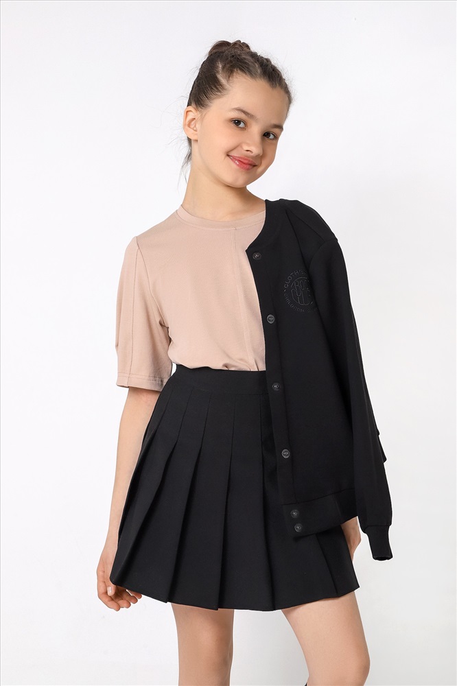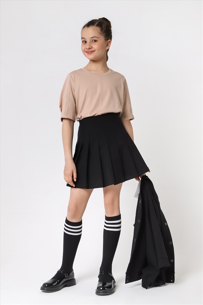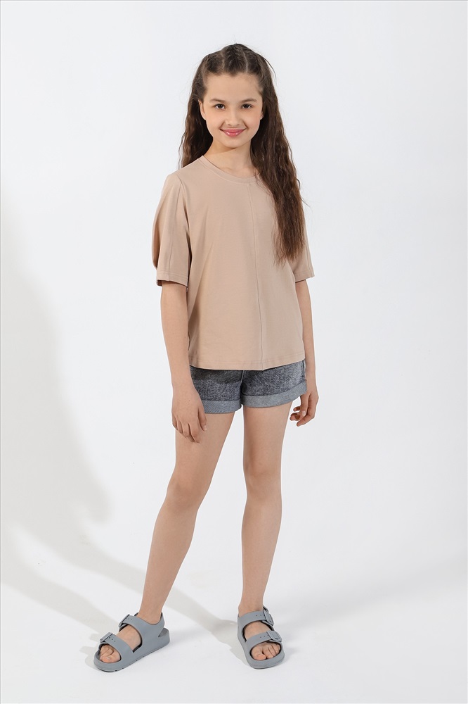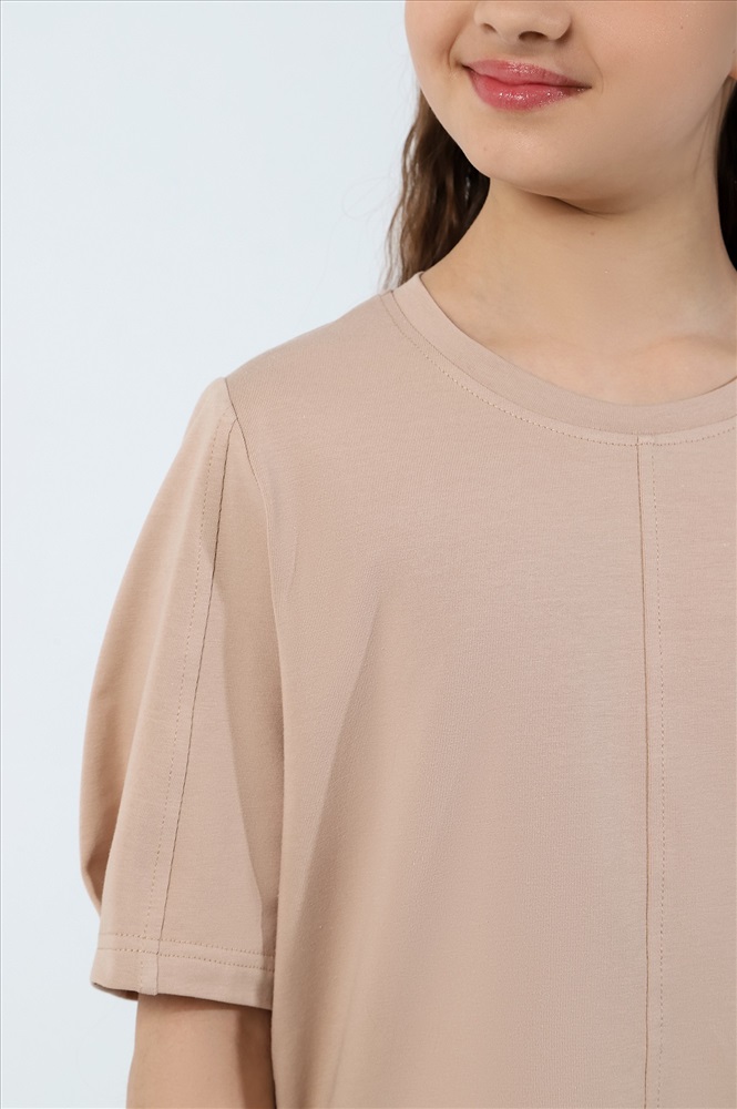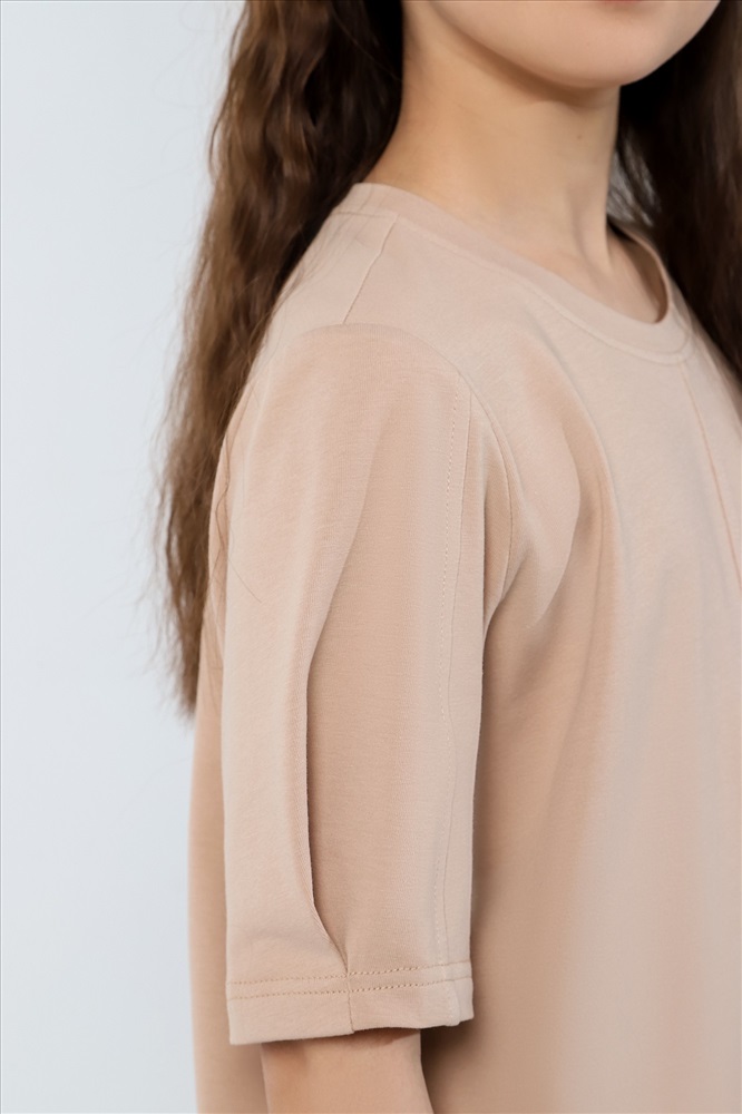 Ткань: Кулирка с лайкрой Футболка для девочек модной объемно-силуэтной формы, с вертикальным отстроченным швом по центру переда. На рукавах также выполнены декоративные вертикальные отстроченные швы и глубокие защипы по низу.