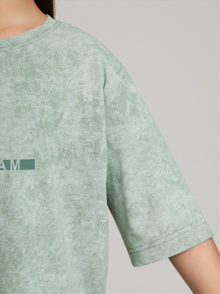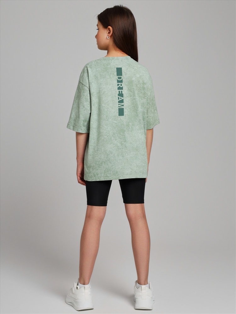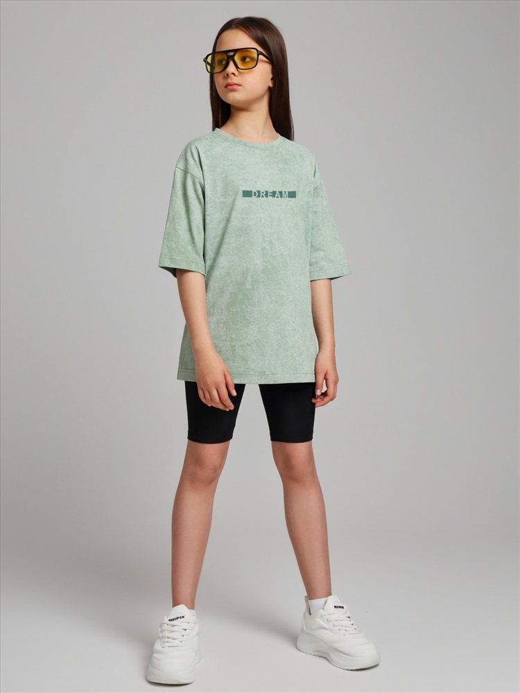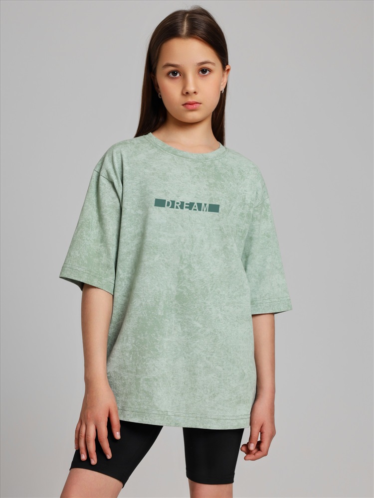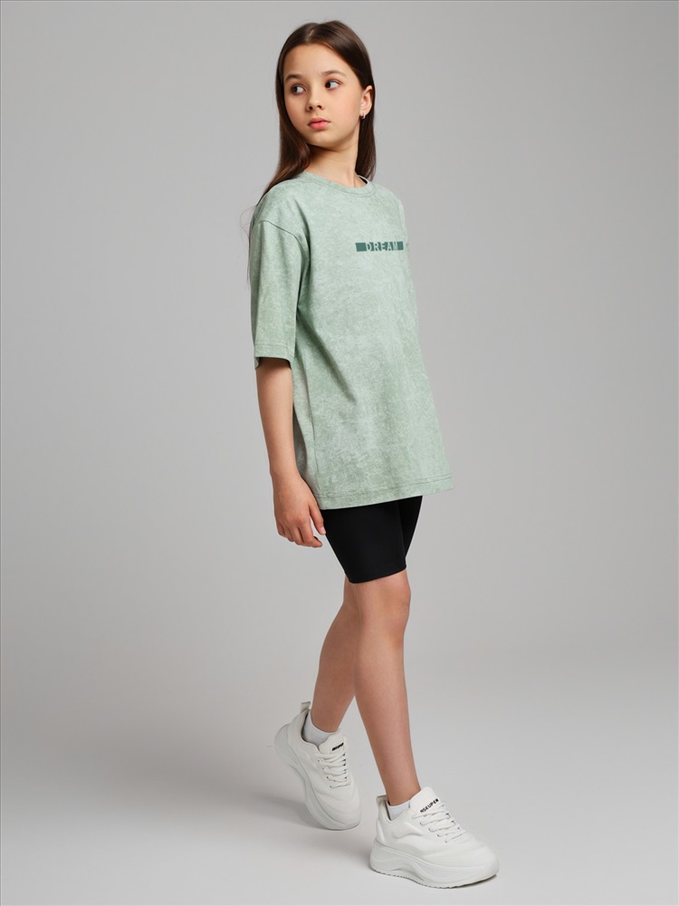 Футболка для девочки из трикотажного полотна "кулирка-варенка", с удлиненными плечевыми швами, втачными короткими рукавами, горловиной овальной формы, обработанной втачной планкой, и принтом на детали переда, выполненным в технике шелкографии. По горловине изделия настрочена отделочная строчка.