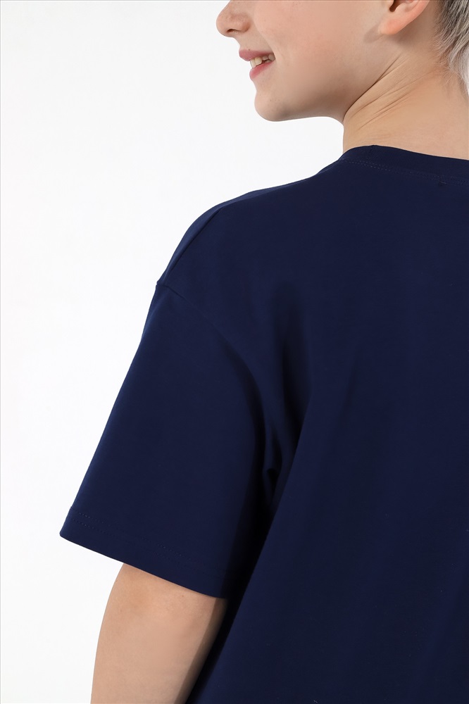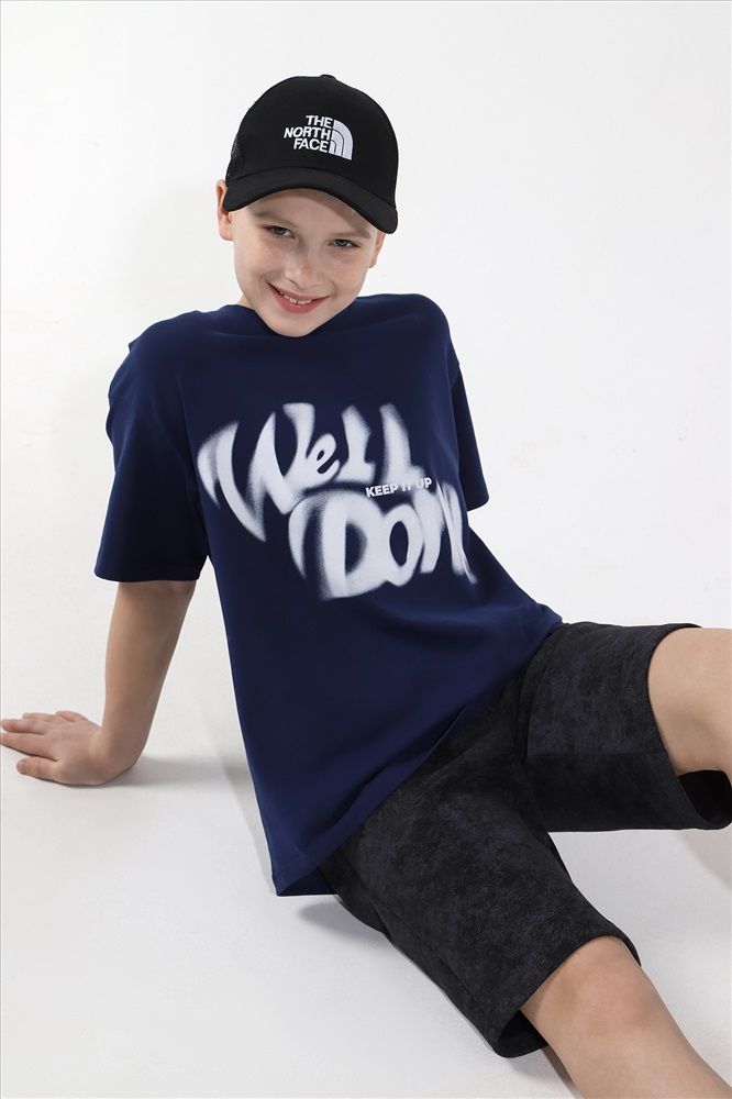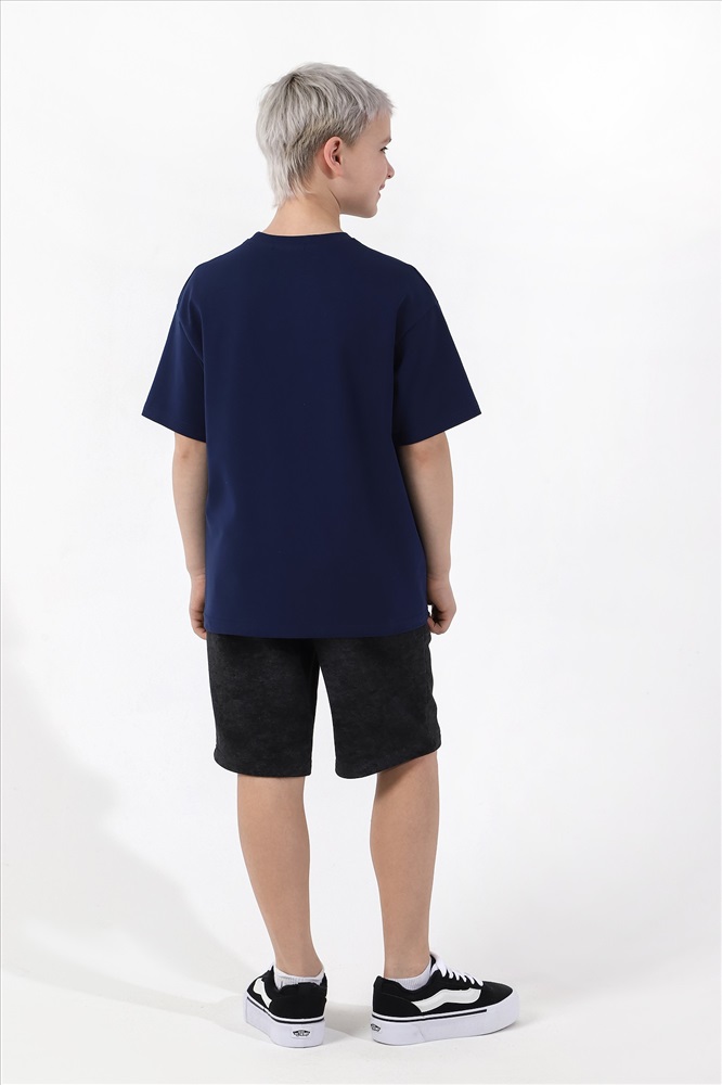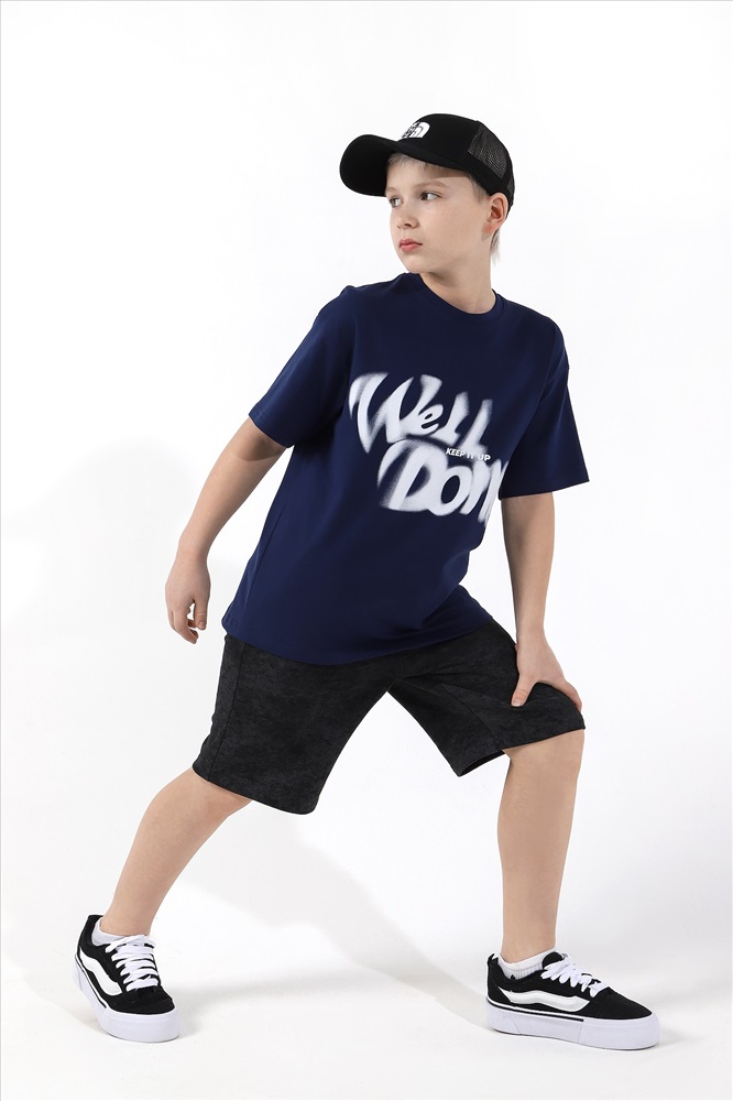 Футболка оверсайз для мальчика из трикотажного полотна: хлопкового с добавлением лайкры. Модель с принтом на переде, спущенной линией плеч, рукавами длиной до локтя.