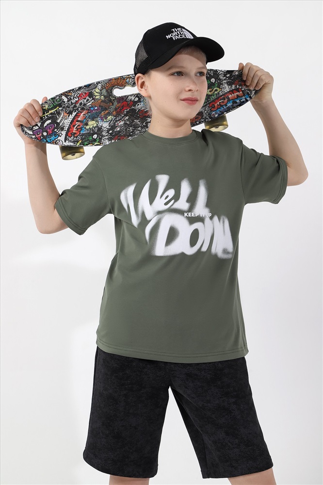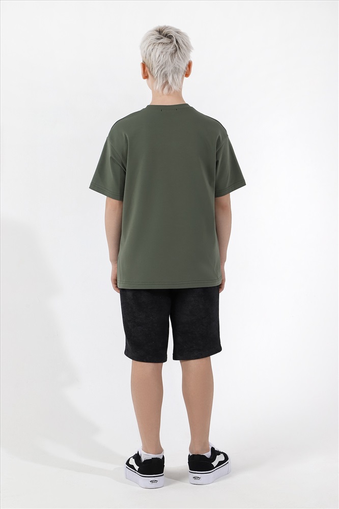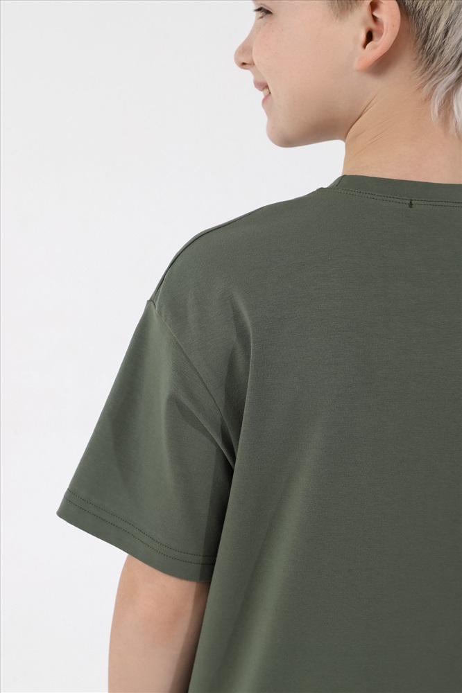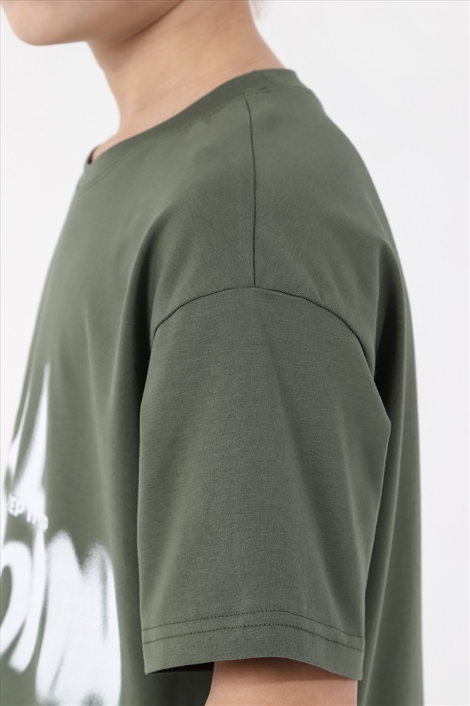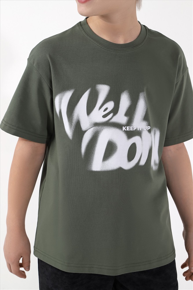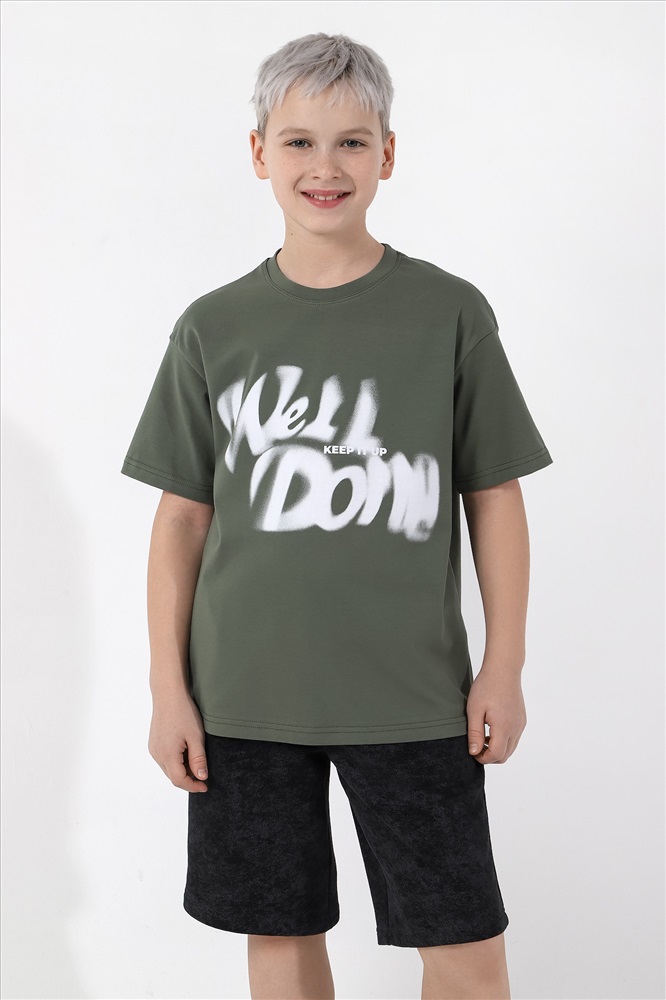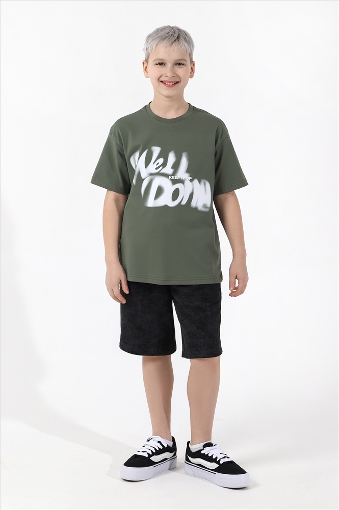 Футболка оверсайз для мальчика из трикотажного полотна: хлопкового с добавлением лайкры. Модель с принтом на переде, спущенной линией плеч, рукавами длиной до локтя.