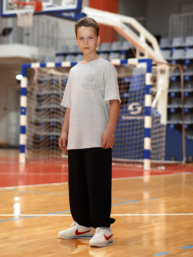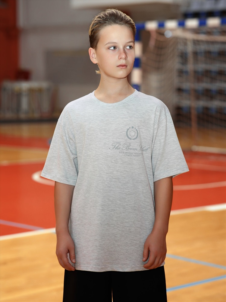 Футболка для мальчика из трикотажного полотна "кармеланж" с приспущенным плечом, втачными короткими рукавами, горловиной овальной формы, обработанной втачной планкой и принтом на полочке, выполненным в технике шелкографии. По шву втачивания планки в горловину настрочена отделочная строчка.