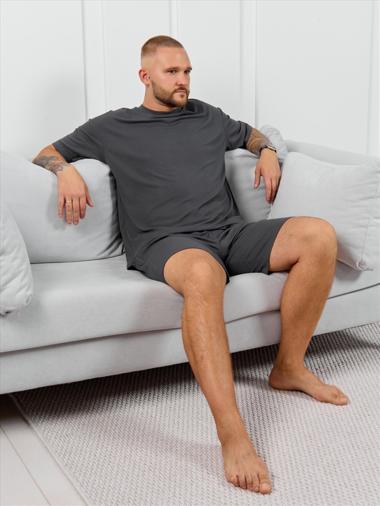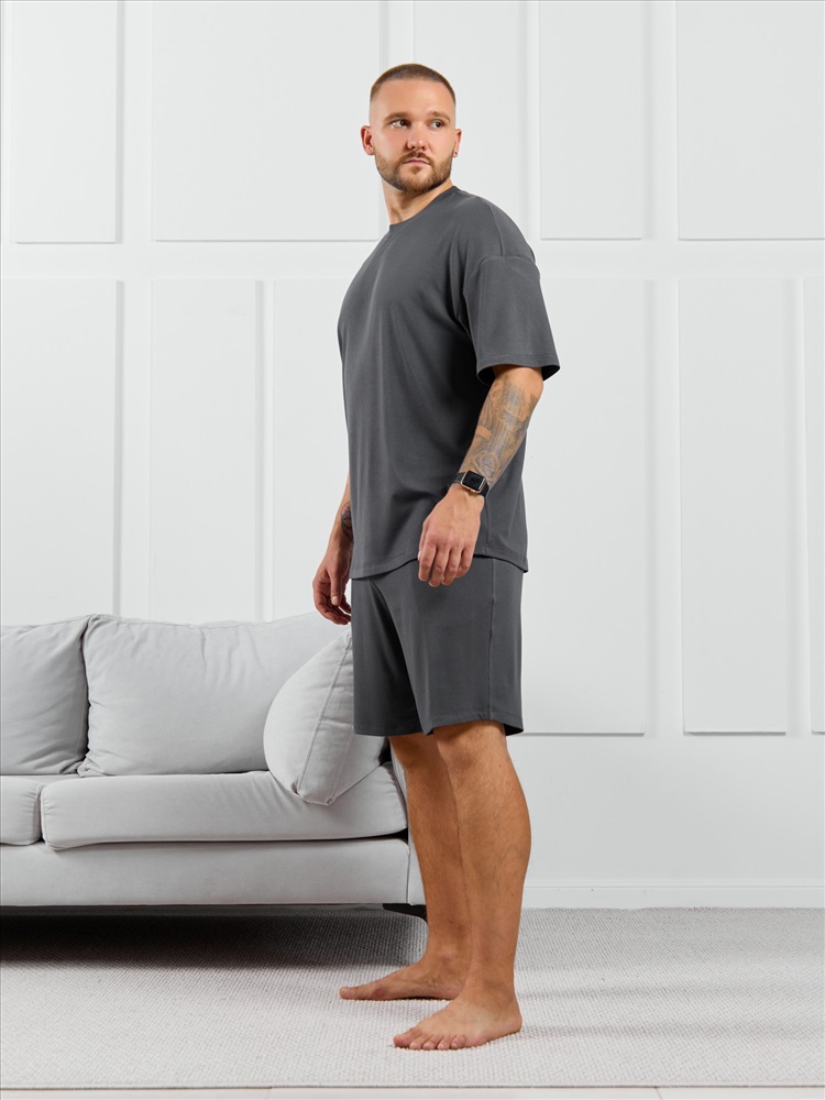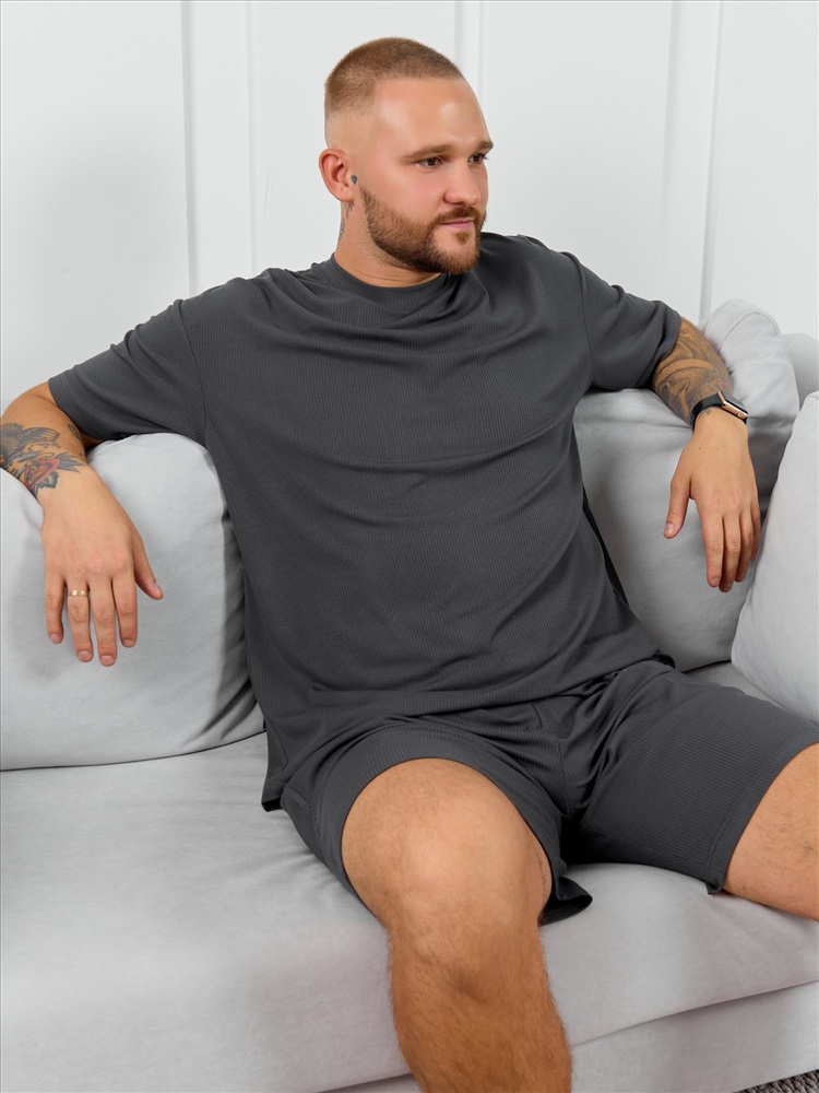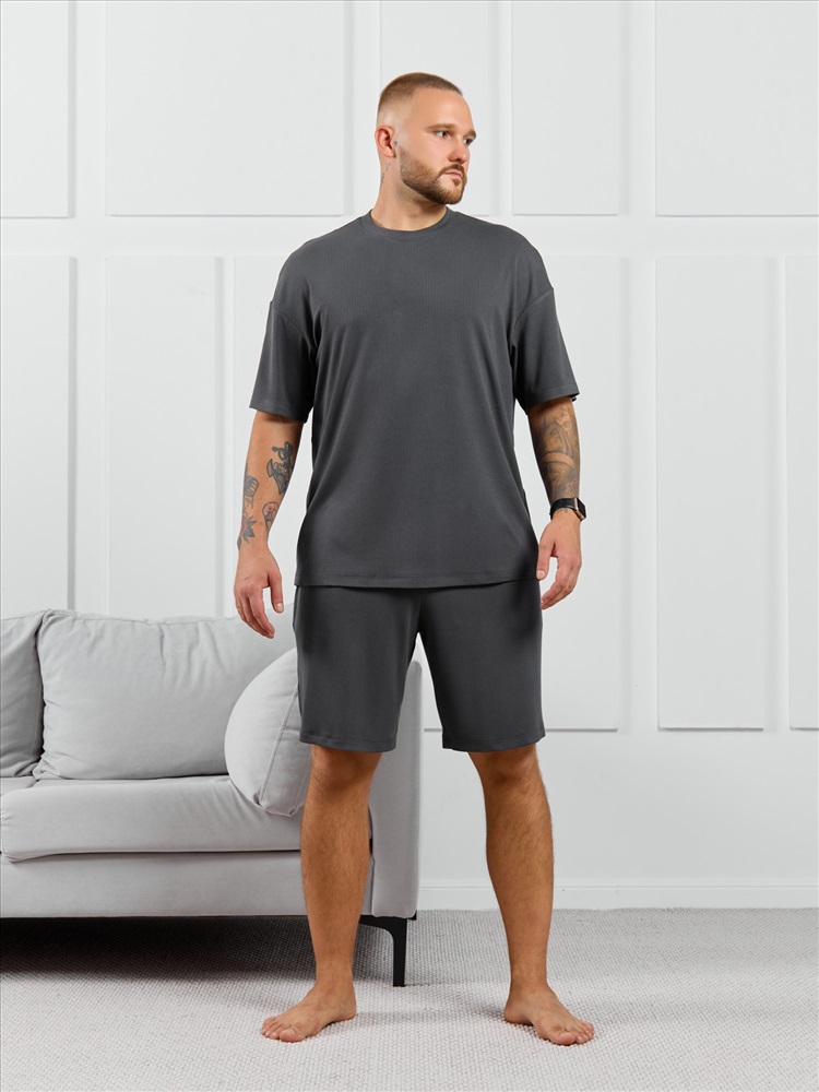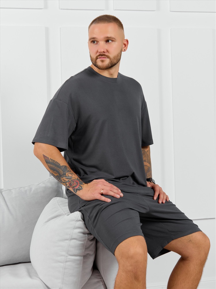 Футболка мужская из пластичного однотонного трикотажного полотна в рубчик, приятного к телу. Модель свободная, со спущенной линией плеч, рукавами длиной до локтя. Может подойти для отдыха, прогулок и занятий спортом.