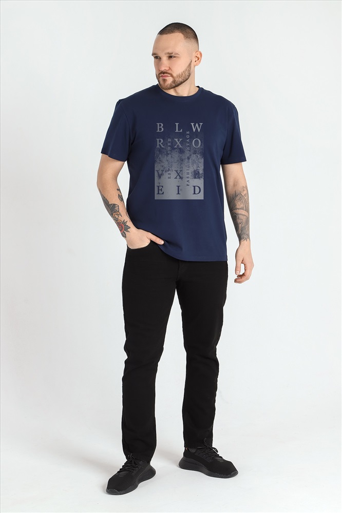 Ткань: Кулирка с лайкрой Футболка мужская из гладкокрашеного трикотажного полотна "кулирка" с лайкрой, классическогоь покроя, с коротким втачными рукавами, горловиной овальной формы, обработанной втачной планкой и принтом на полочке, выполненным в технике шелкографии.