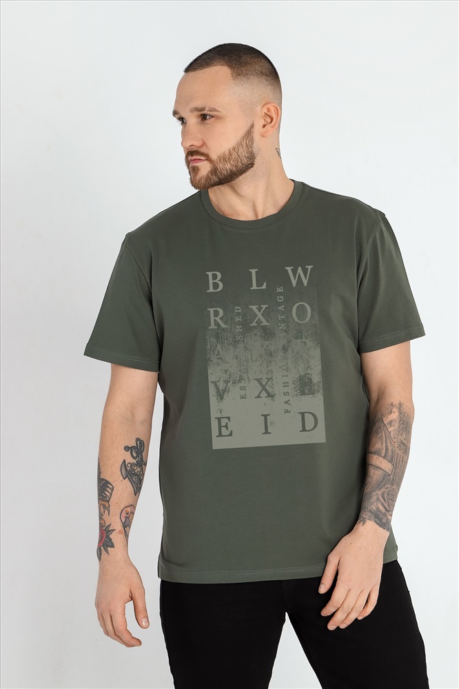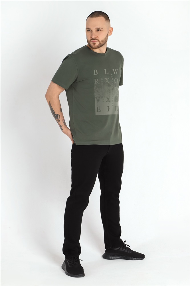 Футболка мужская из гладкокрашеного трикотажного полотна "кулирка" с лайкрой, классическогоь покроя, с коротким втачными рукавами, горловиной овальной формы, обработанной втачной планкой и принтом на полочке, выполненным в технике шелкографии.