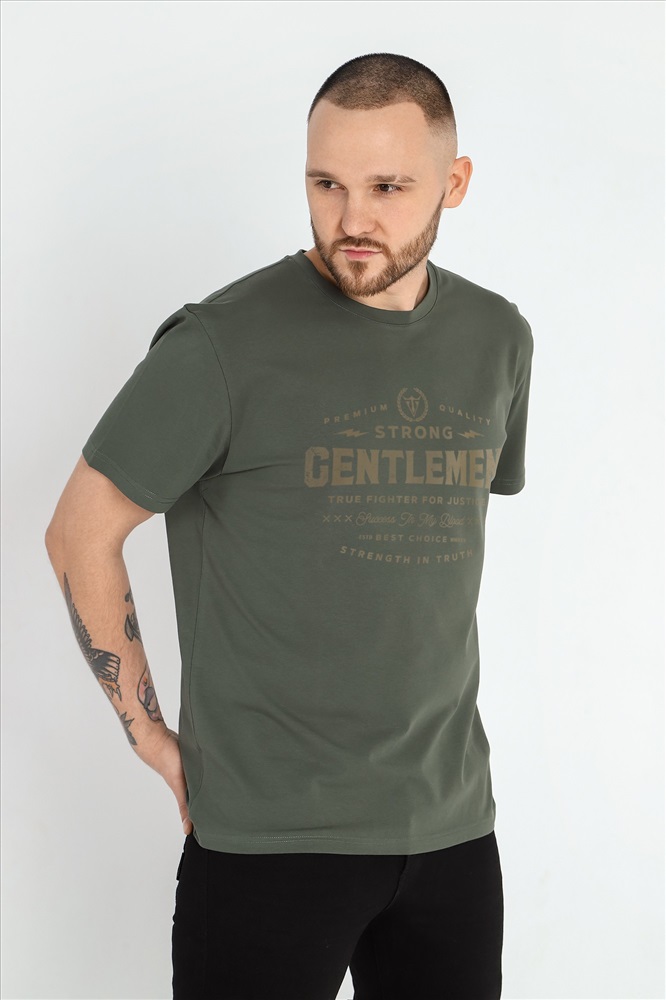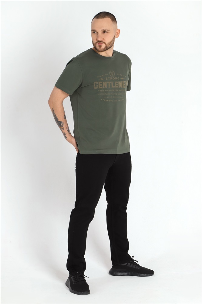 Футболка мужская из гладкокрашеного трикотажного полотна "кулирка" с лайкрой, классическогоь покроя, с коротким втачными рукавами, горловиной овальной формы, обработанной втачной планкой и принтом на полочке, выполненным в технике шелкографии.