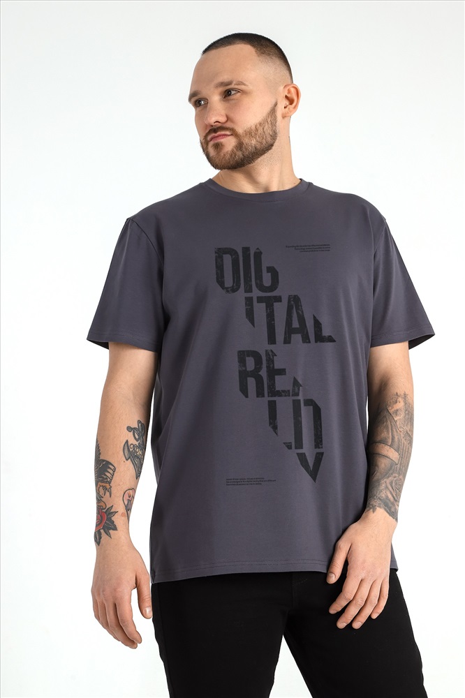 Футболка мужская из гладкокрашеного трикотажного полотна "кулирка" с лайкрой, классическогоь покроя, с коротким втачными рукавами, горловиной овальной формы, обработанной втачной планкой и принтом на полочке, выполненным в технике шелкографии.