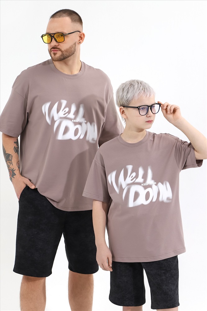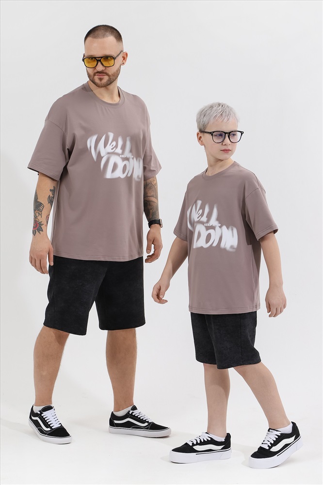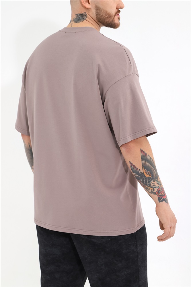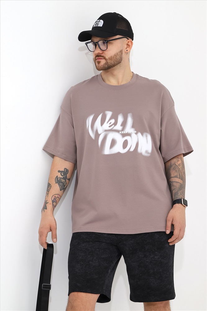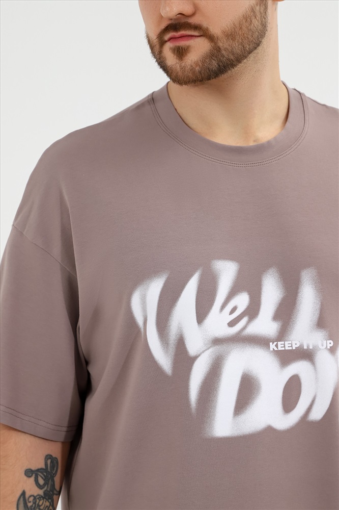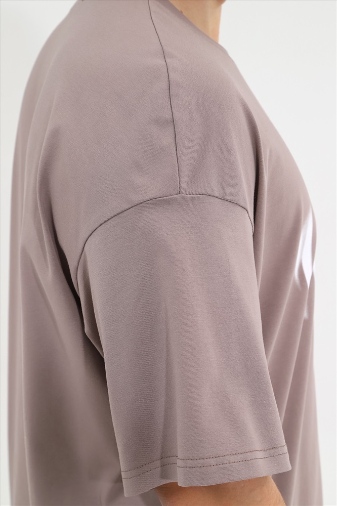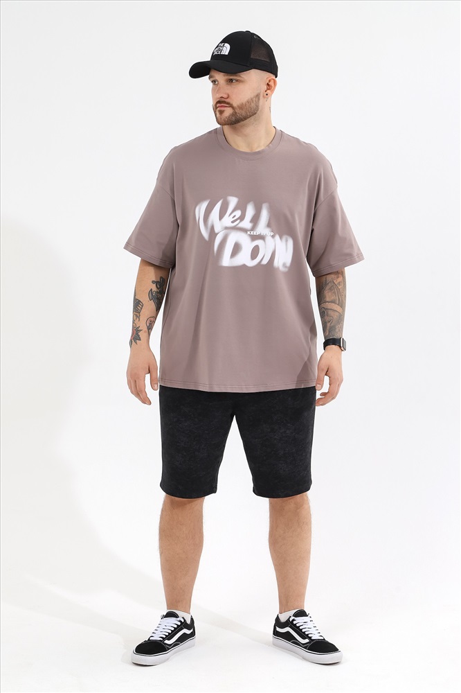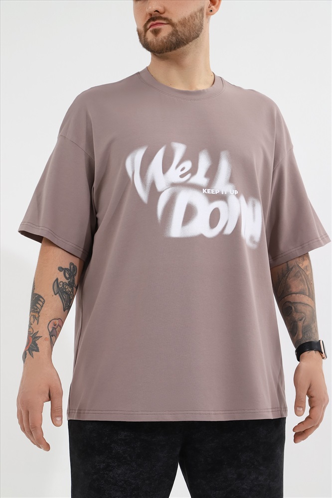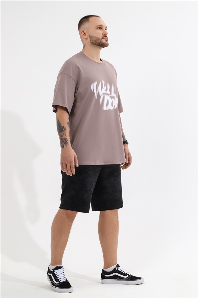 Футболка мужская оверсайз из трикотажного полотна: хлопкового с добавлением лайкры. Модель с принтом на переде, спущенной линией плеч, рукавами длиной до локтя.