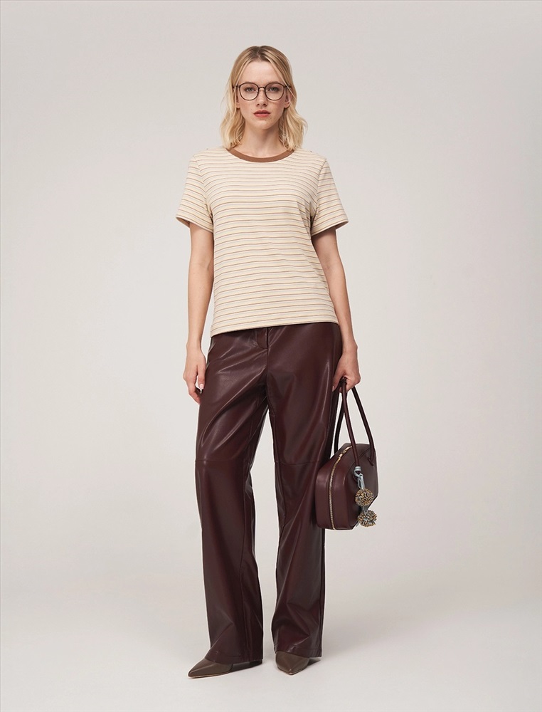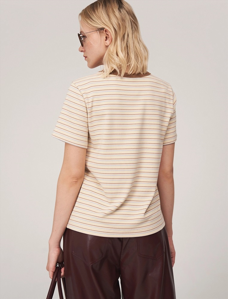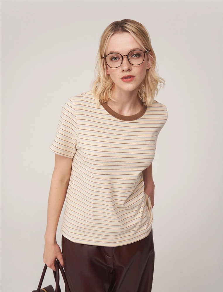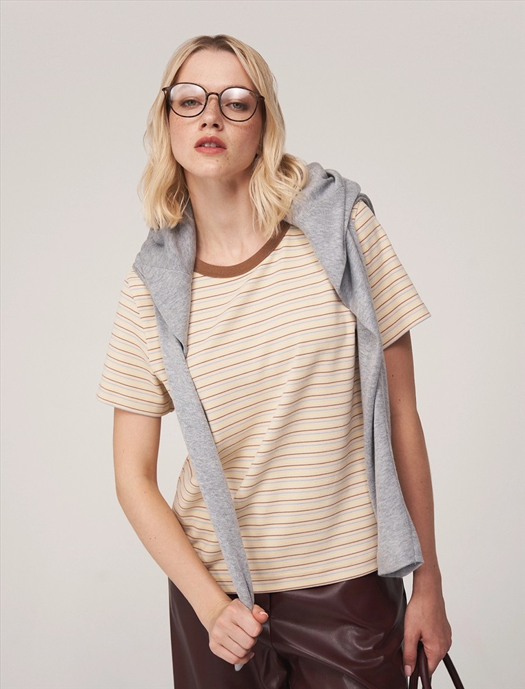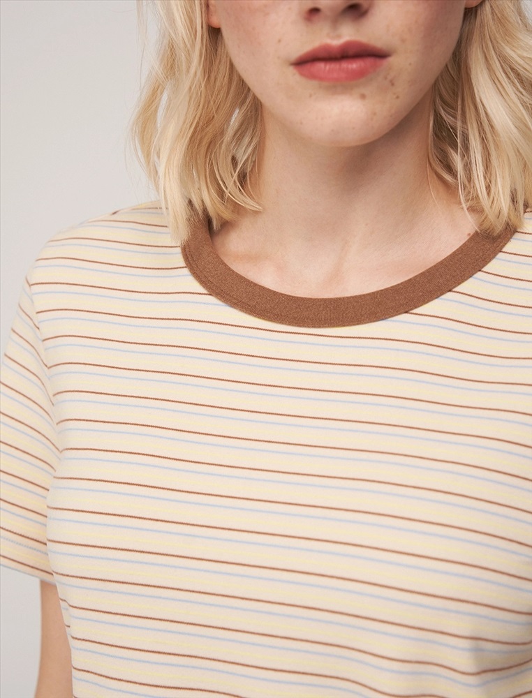 Видео: https-//hassfashion.ru/upload/iblock/a8d/e059yzrsgbnai75zan0rcrxrpdauflq9.mp4 осень-зима 70% Хлопок, 25% Вискоза, 5% Спандекс Футболка прямого силуэта с регулярной контрастной горловиной. Ткань – хлопок и вискоза с добавлением спандекса, что продлевает срок эксплуатации изделия. Цвета полосок выполнены в оттенках коллекции.